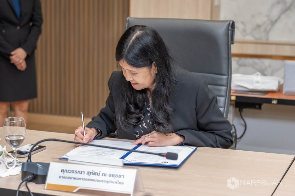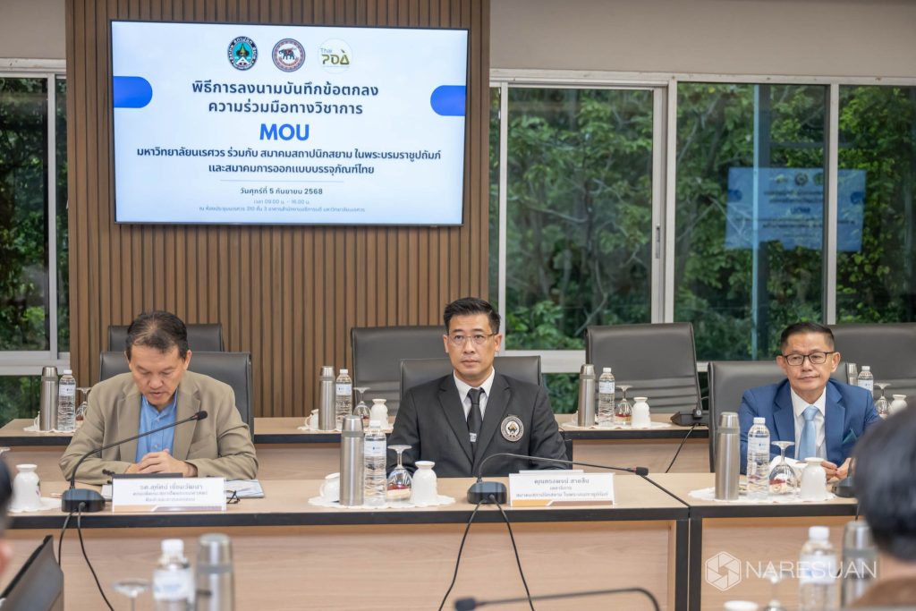 เมื่อวันที่ 5 กันยายน 2568 คณะสถาปัตยกรรมศาสตร์ ศิลปะและการออกบบ มหาวิทยาลัยนเรศวร จัดพิธีลงนามบันทึกข้อตกลงความร่วมมือทางวิชาการ (MOU) ระหว่างมหาวิทยาลัยนเรศวร โดย รองศาสตราจารย์ ดร.ศรินทร์ทิพย์ แทนธานี รักษาราชการแทนอธิการบดี มหาวิทยาลัยนเรศวร กับ คุณอเส สุขยางค์ นายกสมาคมสถาปนิกสยาม ในพระบรมราชูปถัมภ์ และ คุณวรรณา สุทัศน์ ณ อยุธยา นายกสมาคมการออกแบบบรรจุภัณฑ์ไทย โดยมีวัตถุประสงค์เพื่อเสริมสร้างศักยภาพด้านวิชาการ งานวิจัย และการพัฒนาวิชาชีพทางการออกแบบ อันเป็นประโยชน์ต่อการพัฒนาอุตสาหกรรมสร้างสรรค์ ทั้งในระดับภูมิภาค และระดับประเทศอย่างยั่งยืน เสริมสร้างศักยภาพบุคลากรในวิชาชีพออกแบบให้มีความเข้มแข็งยิ่งขึ้น พัฒนามาตรฐาน และนวัตกรรมด้านสถาปัตยกรรม และการออกแบบบรรจุภัณฑ์ให้สอดคล้องกับความต้องการของสังคม และอุตสาหกรรมต่อไป ซึ่งพิธีลงนามในครั้งนี้จัดขึ้นที่ ห้องประชุม 310 ชั้น 3 อาคารสำนักงานอธิการบดี มหาวิทยาลัยนเรศวร