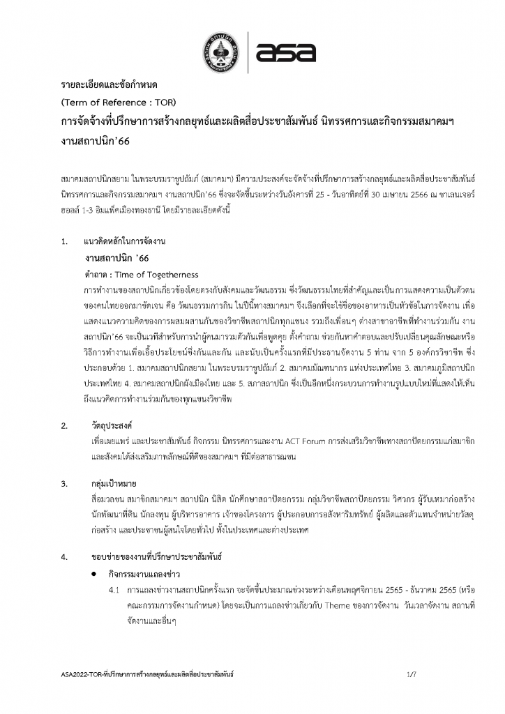 Home » News » ประกาศจัดจ้างที่ปรึกษาการสร้างกลยุทธ์และผลิตสื่อประชาสัมพันธ์ นิทรรศการและกิจกรรมสมาคมฯ งานสถาปนิก’66