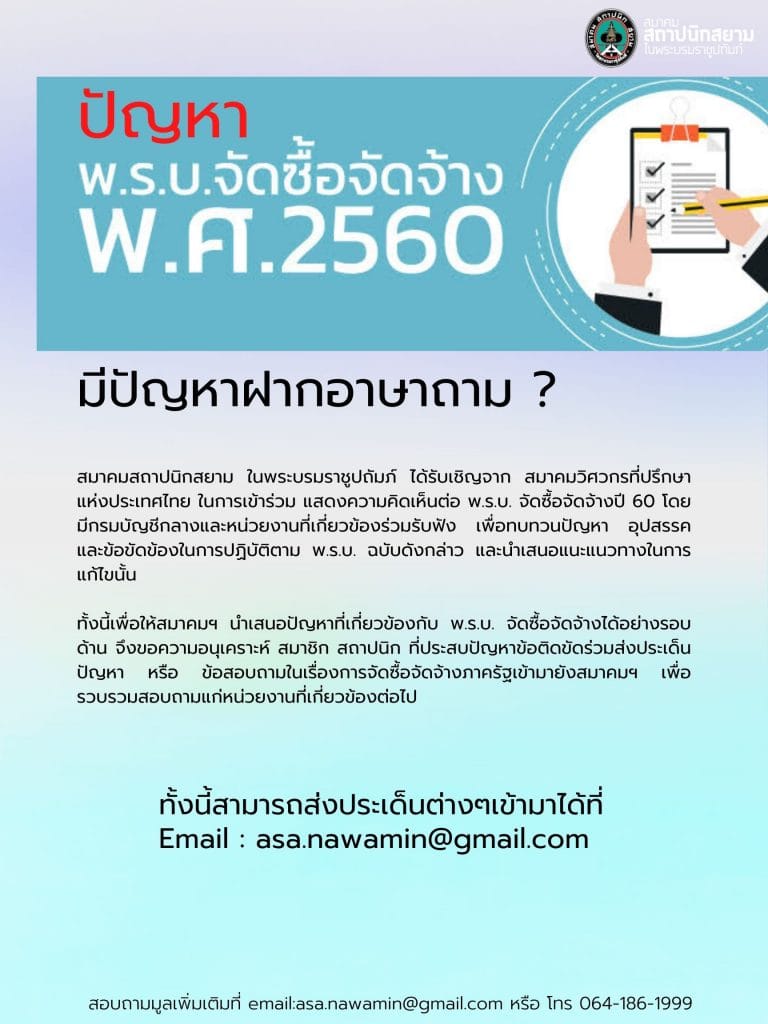 ขอเรียนเชิญสมาชิกสมาคมฯ ส่งประเด็นคำถามเพื่อให้สมาคมสถาปนิกสยามฯ ร่วมแสดงความคิดเห็นต่อ พ.ร.บ จัดซื้อจัดจ้าง พ.ศ. 2560 โดย สมาคมวิศวกรที่ปรึกษา แห่งประเทศไทย จะจัดประชุม ในวันศุกร์ที่ 15 กรกฎาคม 2565