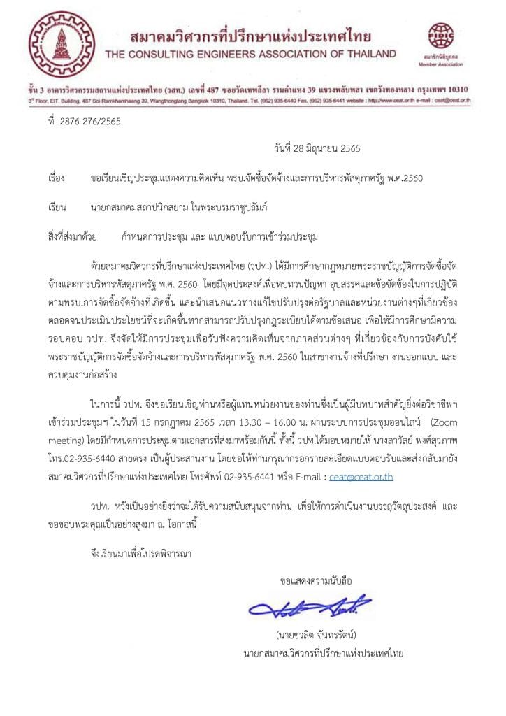 ขอเรียนเชิญสมาชิกสมาคมฯ ส่งประเด็นคำถามเพื่อให้สมาคมสถาปนิกสยามฯ ร่วมแสดงความคิดเห็นต่อ พ.ร.บ จัดซื้อจัดจ้าง พ.ศ. 2560 โดย สมาคมวิศวกรที่ปรึกษา แห่งประเทศไทย จะจัดประชุม ในวันศุกร์ที่ 15 กรกฎาคม 2565