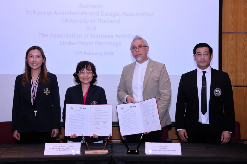 เมื่อวันที่ 17 กุมภาพันธ์ 2569 สมาคมสถาปนิกสยาม ในพระบรมราชูปถัมภ์ นำโดยคุณอเส สุขยางค์ นายกสมาคมฯ พร้อมด้วย นายทรงพจน์ สายสืบ เลขาธิการ และคุณพูลชัย เรืองศิลปานันท์ ประธานกรรมาธิการสถาปนิกบูรพร ได้ร่วมพิธีลงนามบันทึกข้อตกลงความร่วมมือทางด้านวิชาการระหว่าง มหาวิทยาลัยอัสสัมชัญ โดยคณะสถาปัตยกรรมศาสตร์และการออกแบบ ณ มหาวิทยาลัยอัสสัมชัญ นำโดยศาสตราจารย์ ดร.สนธยา วนิชวัฒนะ คณบดีคณะสถาปัตยกรรมศาสตร์และการออกแบบ และ ดร.ศตนันท์ ชโนวรรณะ หัวหน้าภาควิชาสถาปัตยกรรม