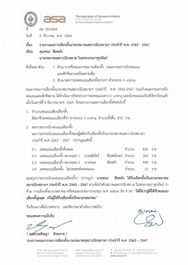 รายงานผลการเลือกตั้งนายกสมาคมสถาปนิกสยาม ในพระบรมราชูปถัมภ์ ประจำปี 2565-2567