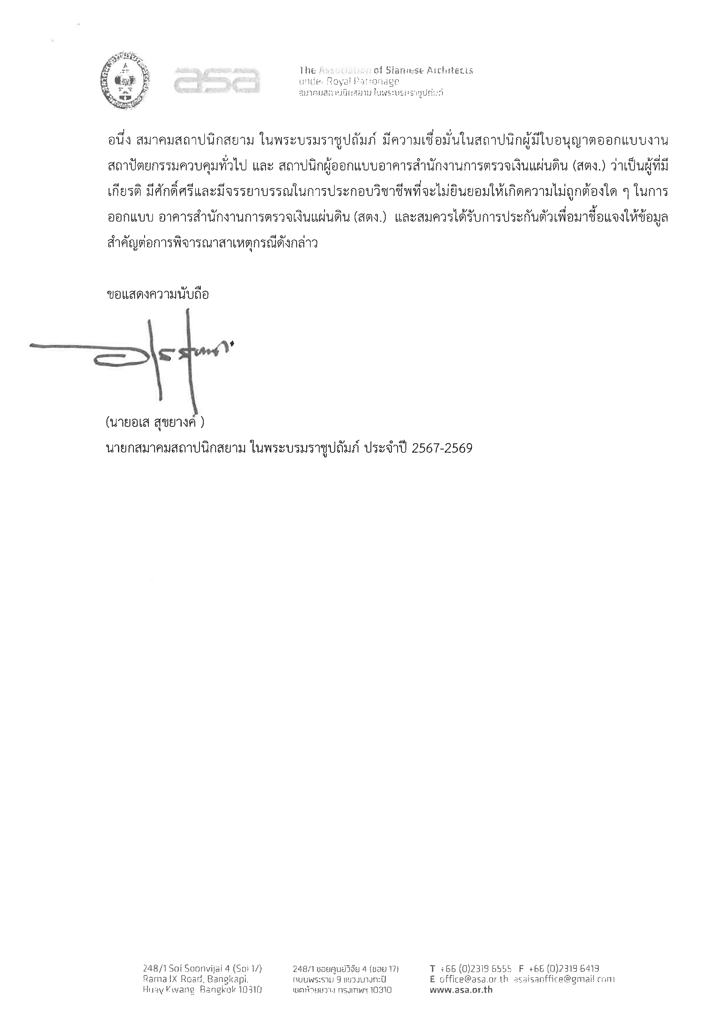 สมาคมฯ ยื่นหนังสือต่อรักษาการนายกรัฐมนตรี ขอเรียกร้องให้พิจารณาทบทวนเพิ่มเติมต่อผลการสืบสวนข้อเท็จจริงกรณีตึก สตง.ถล่ม ต่อสารธาณชน