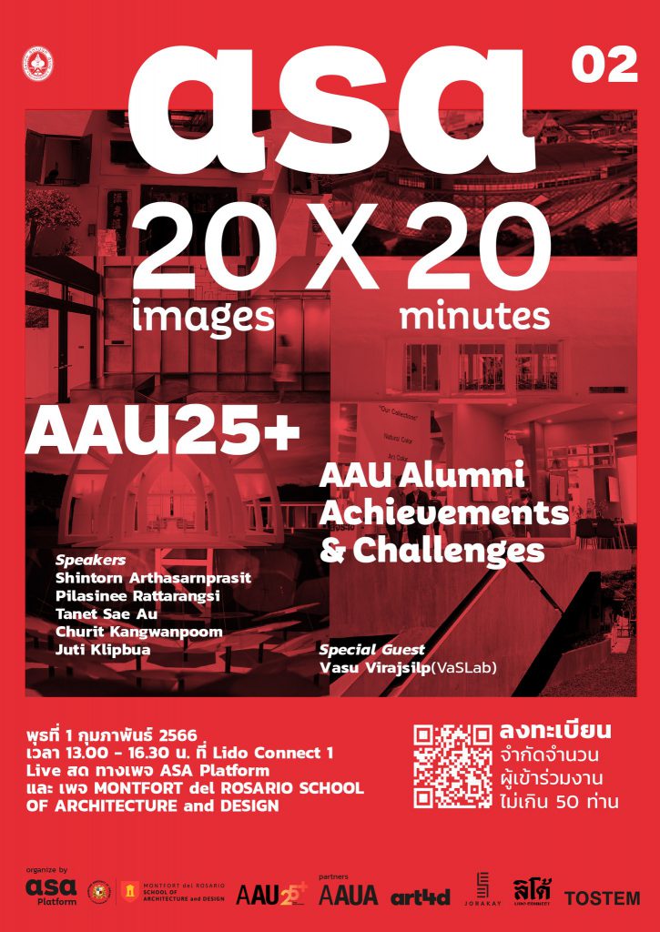 #เข้าร่วมฟรีไม่มีค่าใช้จ่าย วันพุธที่ 1 กุมภาพันธ์ 2566 นี้ ASA Platform ขอเชิญสมาชิกสมาคมฯ สถาปนิก นิสิต-นักศึกษาสถาปัตยกรรม และผู้สนใจทั่วไป เข้าร่วมฟังการนำเสนอความคิดสร้างสรรค์ ความท้าทาย และเรื่องราวความสำเร็จในสายอาชีพการออกแบบสถาปัตยกรรม กับกิจกรรม ASA 20×20 ในรูปแบบ Pecha Kucha .