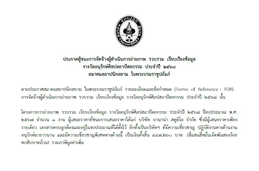 Home » News » ประกาศผู้ผลการจัดจ้างผู้ดำเนินการถ่ายภาพ รวบรวม เรียบเรียงข้อมูล รางวัลอนุรักษ์ศิลปสถาปัตยกรรม ประจำปี 2568