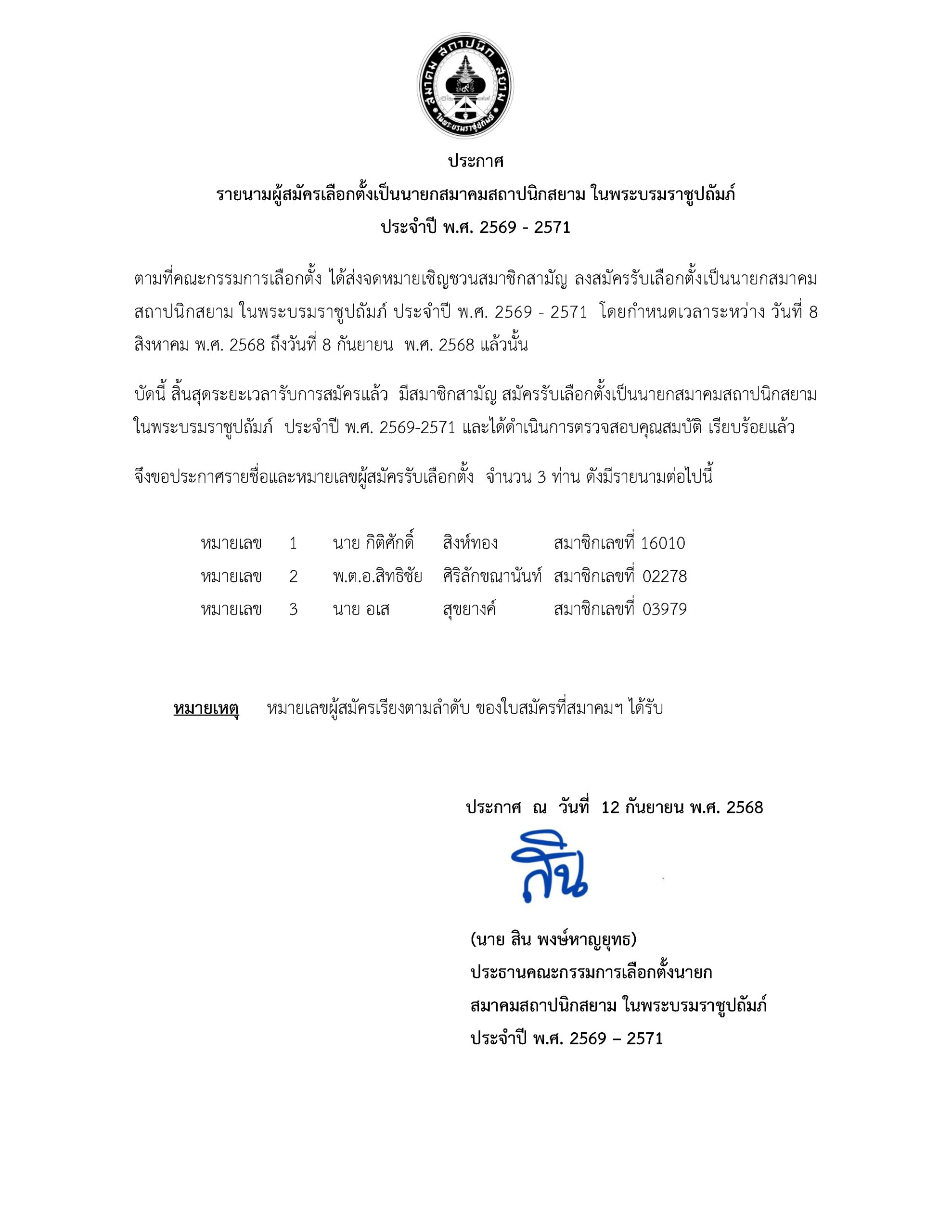 ประกาศ รายนามผู้สมัครเลือกตั้งเป็นนายกสมาคมสถาปนิกสยาม ในพระบรมราชูปถัมภ์ ประจำปี พ.ศ. 2569 – 2571