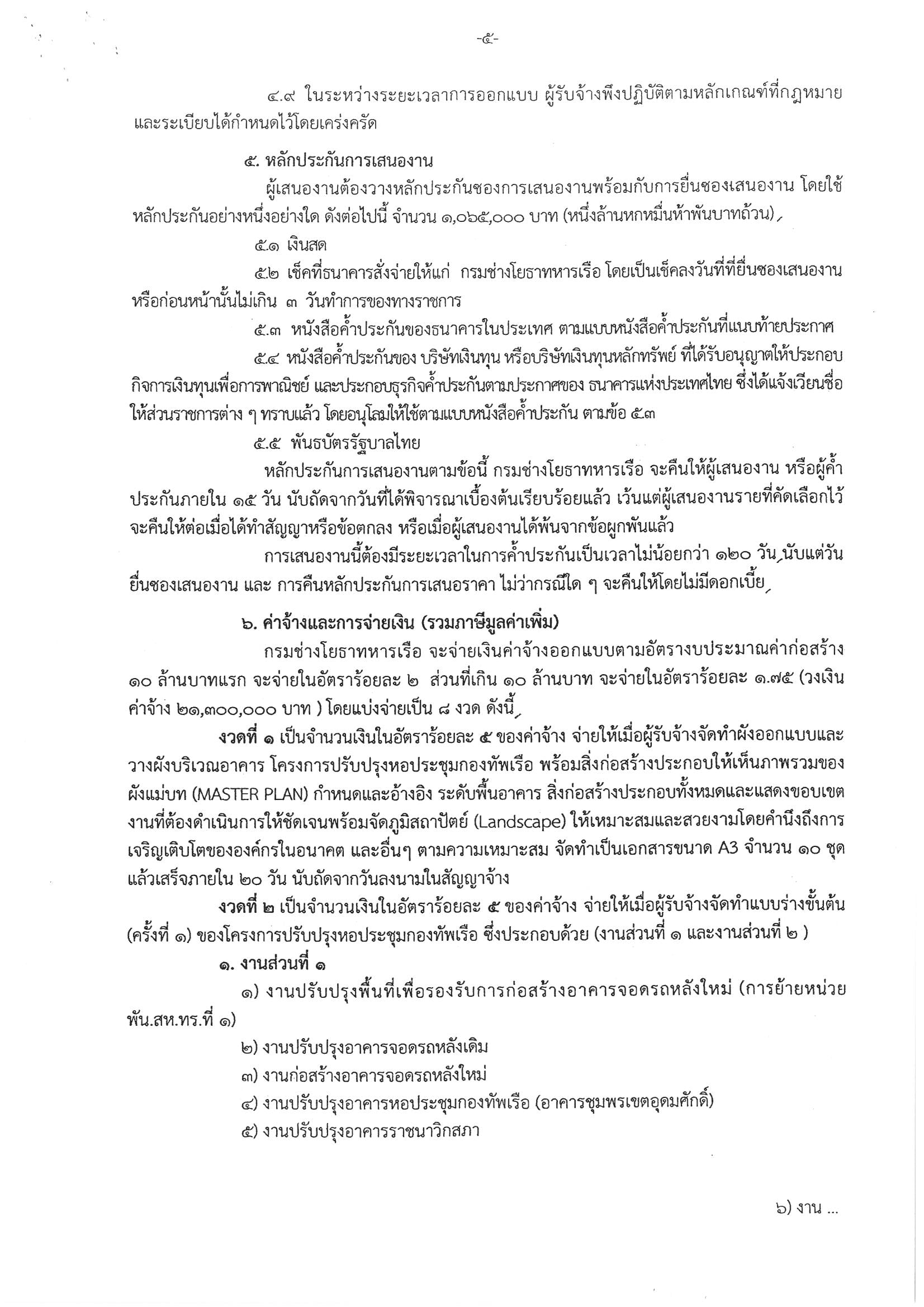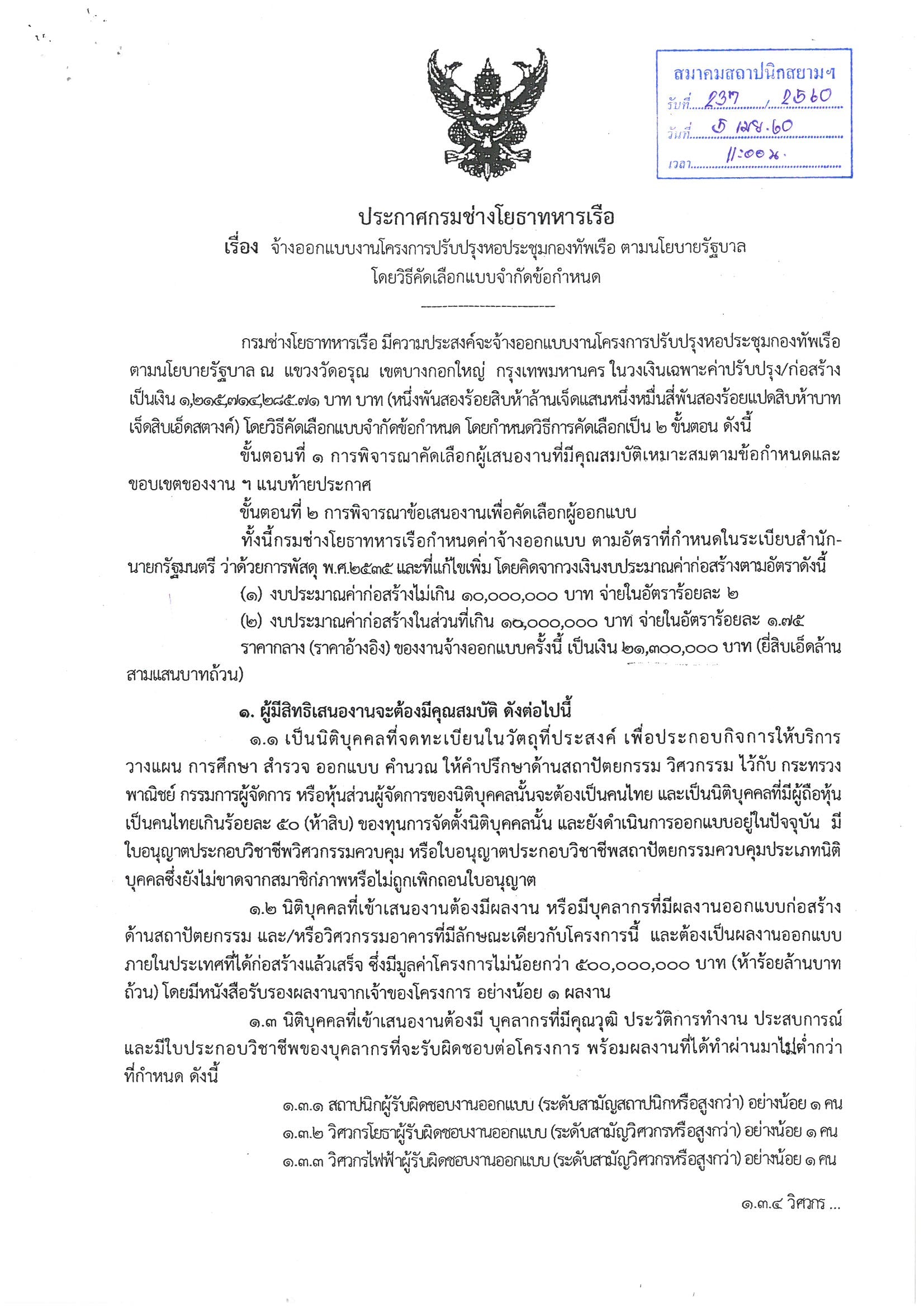 ประกาศกรมช่วงโยธาทหารเรือ เรื่องจ้างออกแบบงานโครงการปรับปรุงหอประชุมกองทัพเรือ ตามนโยบายรัฐบาล โดยวิธีคัดเลือกแบบจำกัดข้อมูล