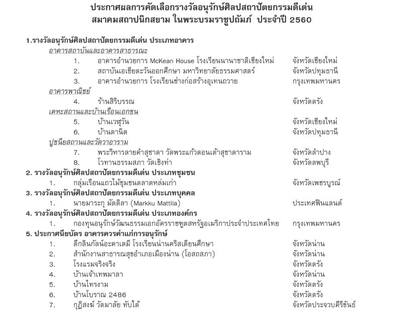 ประกาศรางวัลอนุรักษ์สถาปัตยกรรมดีเด่น ประจำปี 2560