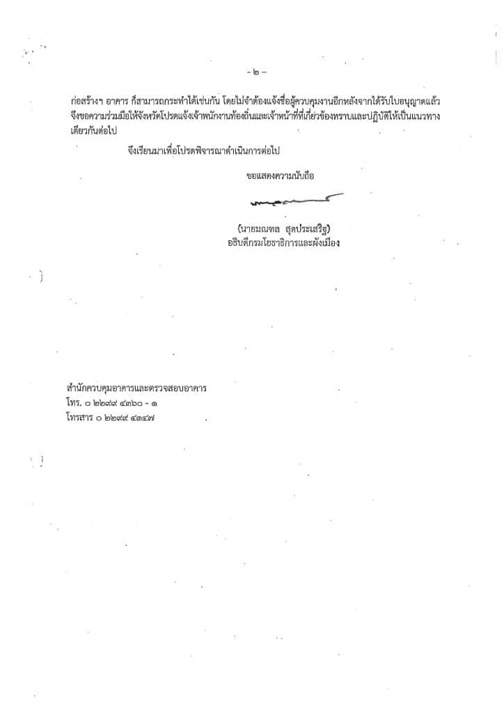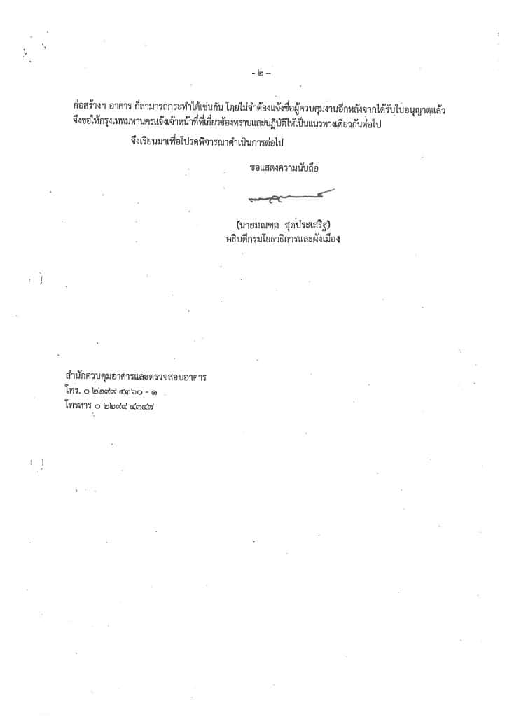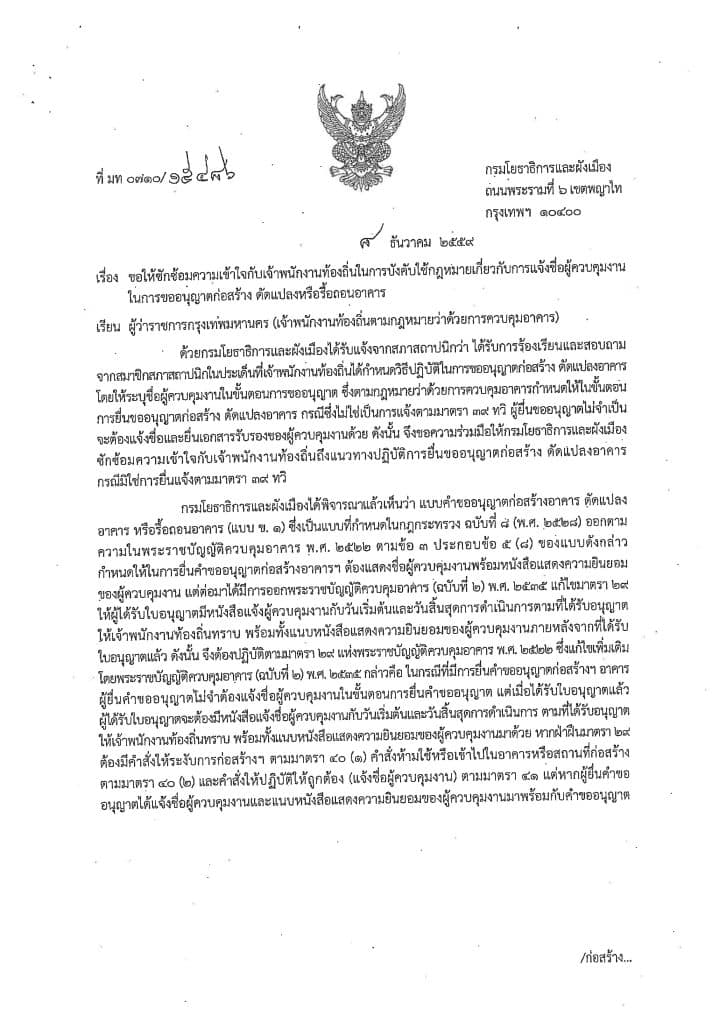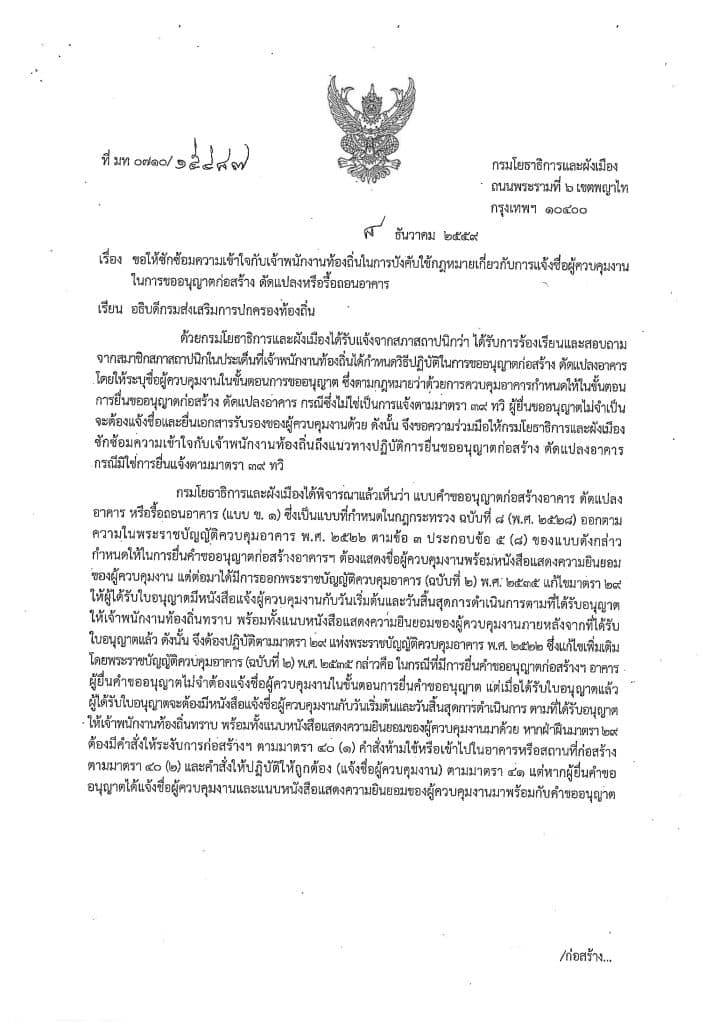 สืบเนื่องจากคณะกรรมการจรรยาบรรณ สภาสถาปนิก มีคำวินิจฉัยให้ลงโทษ ผู้ได้รับใบอนุญาตประกอบวิชาชีพสถาปัตยกรรมควบคุมที่ลงลายมือชื่อเป็นผู้ควบคุมงานเพื่อประกอบการยื่นขออนุญาตก่อสร้างเท่านั้นโดยไม่ได้มีเจตนาที่จะเข้าควบคุมงานจริง เป็นเหตุให้การก่อสร้างเกิดความเสียหายสถาสถาปนิก พิจารณาแล้วเห็นว่า เพื่อการปฏิบัติตามกฎหมายควบคุมอาคารและจรรยาบรรณแห่งวิชาชีพสถาปัตยกรรม จึงขอความร่วมมือประชาสัมพันธ์ข้อมูลแก่สมาชิกสมาคมว่าในการยื่นขออนุญาตก่อสร้างดัดแปลงอาคาร กรณีซึ่งไม่ใช่การแจ้งตามมาตรา 39 ทวิ ผู้ยื่นขออนุญาตไม่จำเป็นจะต้องแจ้งชื่อและยื่นเอกสารรับรองของผู้ควบคุมงาน เพื่อป้องกันการกระทำที่อาจสุ่มเสี่ยงเป็นการประพฤติผิดจรรยาบรรณแห่งวิชาชีพสถาปัตยกรรม ต่อไป