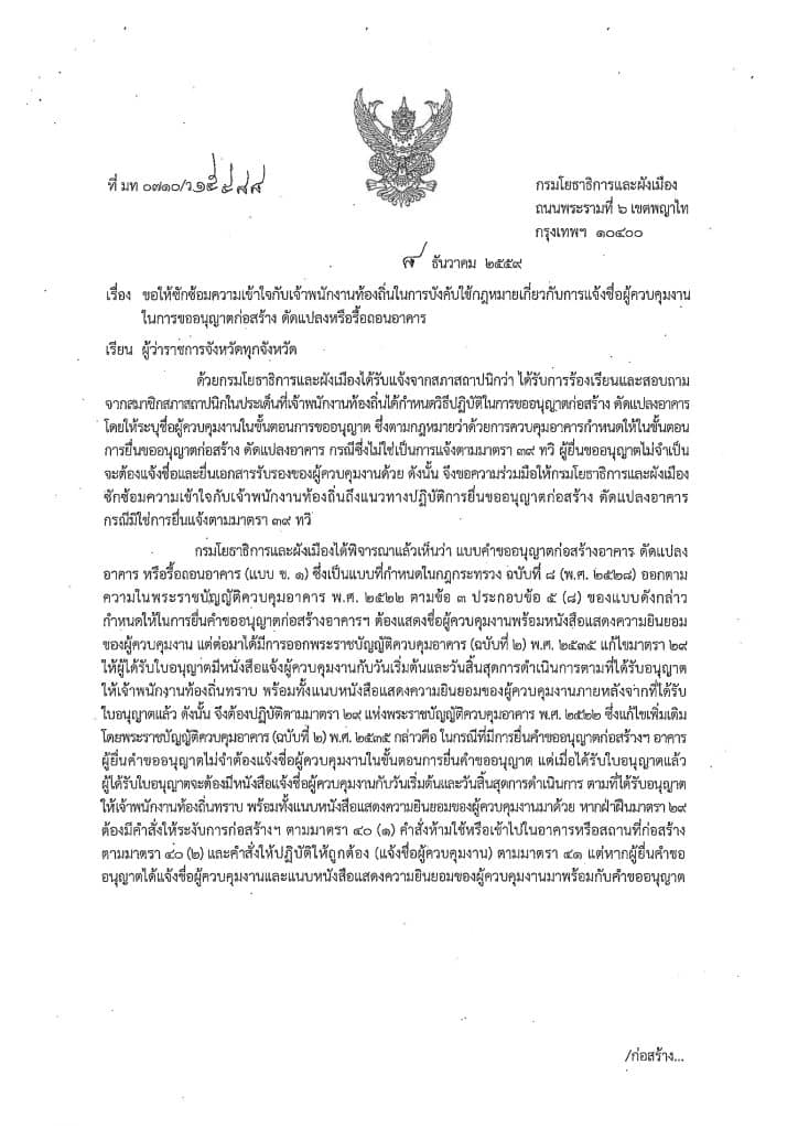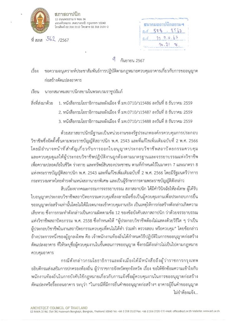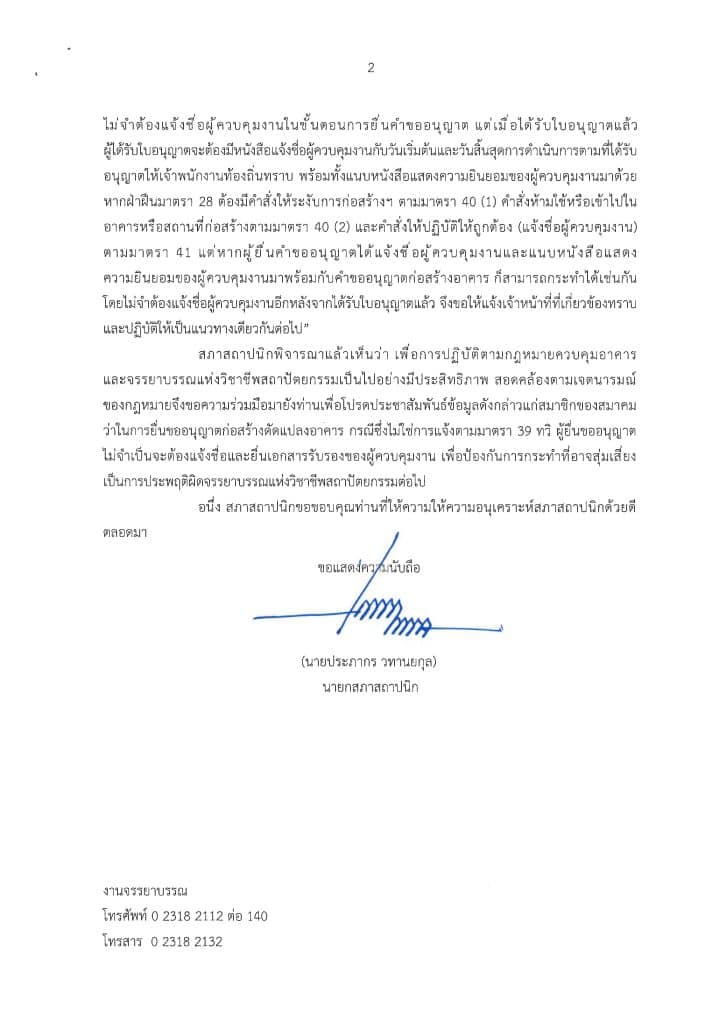 สืบเนื่องจากคณะกรรมการจรรยาบรรณ สภาสถาปนิก มีคำวินิจฉัยให้ลงโทษ ผู้ได้รับใบอนุญาตประกอบวิชาชีพสถาปัตยกรรมควบคุมที่ลงลายมือชื่อเป็นผู้ควบคุมงานเพื่อประกอบการยื่นขออนุญาตก่อสร้างเท่านั้นโดยไม่ได้มีเจตนาที่จะเข้าควบคุมงานจริง เป็นเหตุให้การก่อสร้างเกิดความเสียหายสถาสถาปนิก พิจารณาแล้วเห็นว่า เพื่อการปฏิบัติตามกฎหมายควบคุมอาคารและจรรยาบรรณแห่งวิชาชีพสถาปัตยกรรม จึงขอความร่วมมือประชาสัมพันธ์ข้อมูลแก่สมาชิกสมาคมว่าในการยื่นขออนุญาตก่อสร้างดัดแปลงอาคาร กรณีซึ่งไม่ใช่การแจ้งตามมาตรา 39 ทวิ ผู้ยื่นขออนุญาตไม่จำเป็นจะต้องแจ้งชื่อและยื่นเอกสารรับรองของผู้ควบคุมงาน เพื่อป้องกันการกระทำที่อาจสุ่มเสี่ยงเป็นการประพฤติผิดจรรยาบรรณแห่งวิชาชีพสถาปัตยกรรม ต่อไป