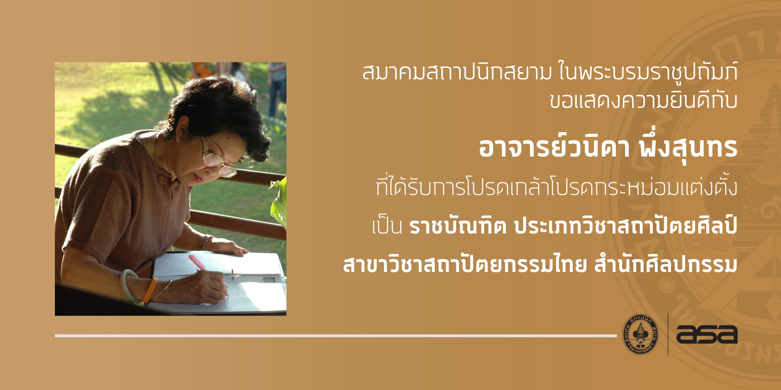 สมาคมสถาปนิกสยามฯ ขอแสดงความยินดีกับ อาจารย์วนิดา พึ่งสุนทร ได้รับแต่งตั้งเป็นราชบัณฑิต ประเภทวิชาสถาปัตยศิลป์ สาขาวิชาสถาปัตยกรรมไทย สำนักศิลปกรรม