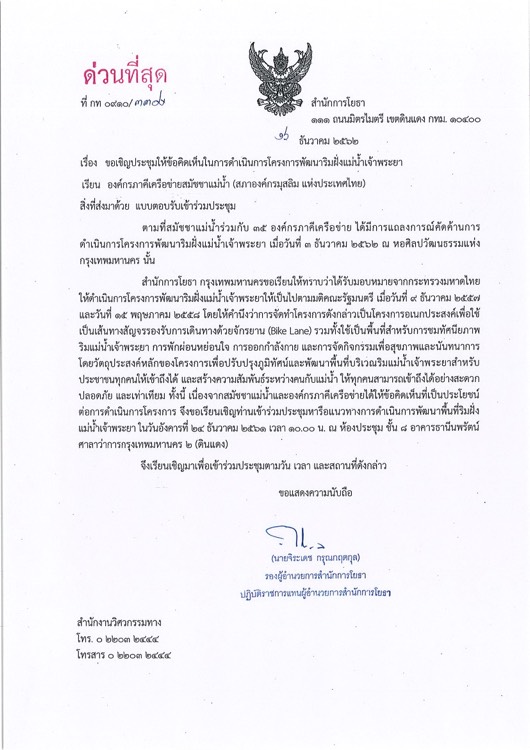 จดหมายขอเชิญประชุมให้ข้อคิดเห็นในการดำเนินการโครงการพัฒนาริมฝั่งแม่น้ำเจ้าพระยา
