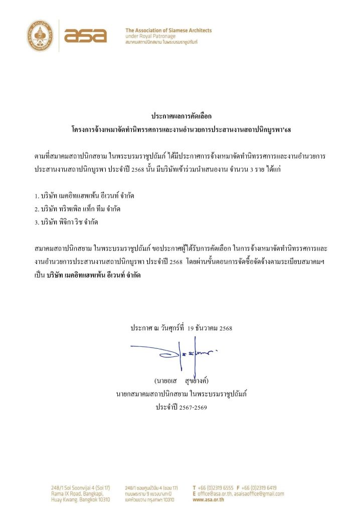 Home » News » ประกาศผลการคัดเลือก โครงการจ้างเหมาจัดทำนิทรรศการและงานอำนวยการประสานงานสถาปนิกบูรพา’68
