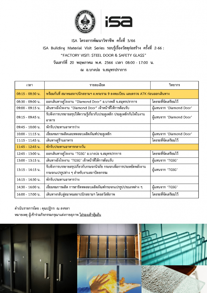 Home » News » 20 พ.ค. 66 | ISA โครงการพัฒนาวิชาชีพ ครั้งที่ 5/66 “FACTORY VISIT: STEEL DOOR & SAFETY GLASS”