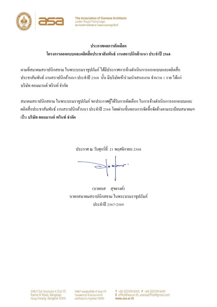 ประกาศผลการคัดเลือก โครงการออกแบบและผลิตสื่อประชาสัมพันธ์ งานสถาปนิกล้านนา ประจำปี 2568