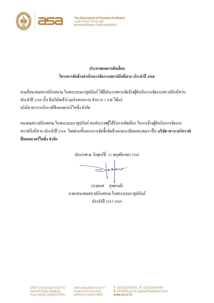 ประกาศผลการคัดเลือก โครงการจัดจ้างดำเนินการจัดงานสถาปนิกอีสาน ประจำปี 2568