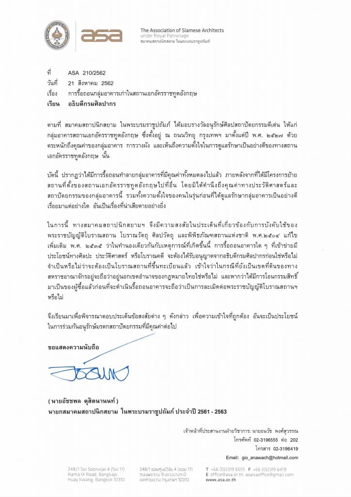 โดยทางสมาคมฯ ได้มีการออกหนังสือเรียนไปยัง เอกอัครราชทูตอังกฤษประจำประเทศไทย และอธิบดีกรมศิลปากร เพื่อชี้แจงและเพื่อความเข้าใจที่ถูกต้องต่อไป