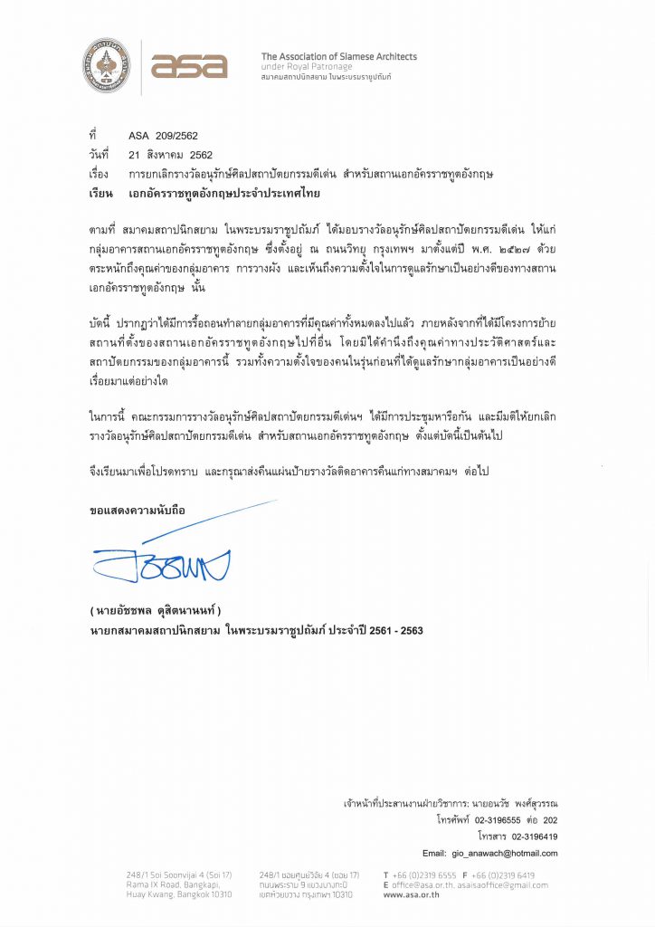 บัดนี้ ปรากฏว่าได้มีการรื้่อถอนทำลายกลุ่มอาคารที่มีคุณค่าทั้งหมดนั้นไปแล้ว โดยมิได้คำนึงถึงคุณค่าทางประวัติศาสตร์และสถาปัตยกรรมของกลุ่มอาคารนี้ คณะกรรมการรางวัลอนุรักษ์ศิลปสถาปัตยกรรมดีเด่นฯ ได้มีการประชุมหารือกัน และมีมติให้ยกเลิกรางวัลอนุรักษ์ศิลปสถาปัตยกรรมดีเด่น สำหรับสถานเอกอัครราชทูตอังกฤษ ตั้งแต่บัดนี้เป็นต้นไป และกรุณาส่งคืนแผ่นป้ายรางวัลติดอาคารคืนแก่ทางสมาคมฯ ต่อไป