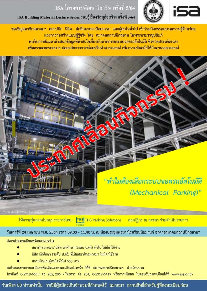 24 เม.ย. 64 | ISA โครงการพัฒนาวิชาชีพ ครั้งที่ 5/64 “ทำไมต้องเลือกระบบจอดรถอัตโนมัติ (Mechanical Parking)”