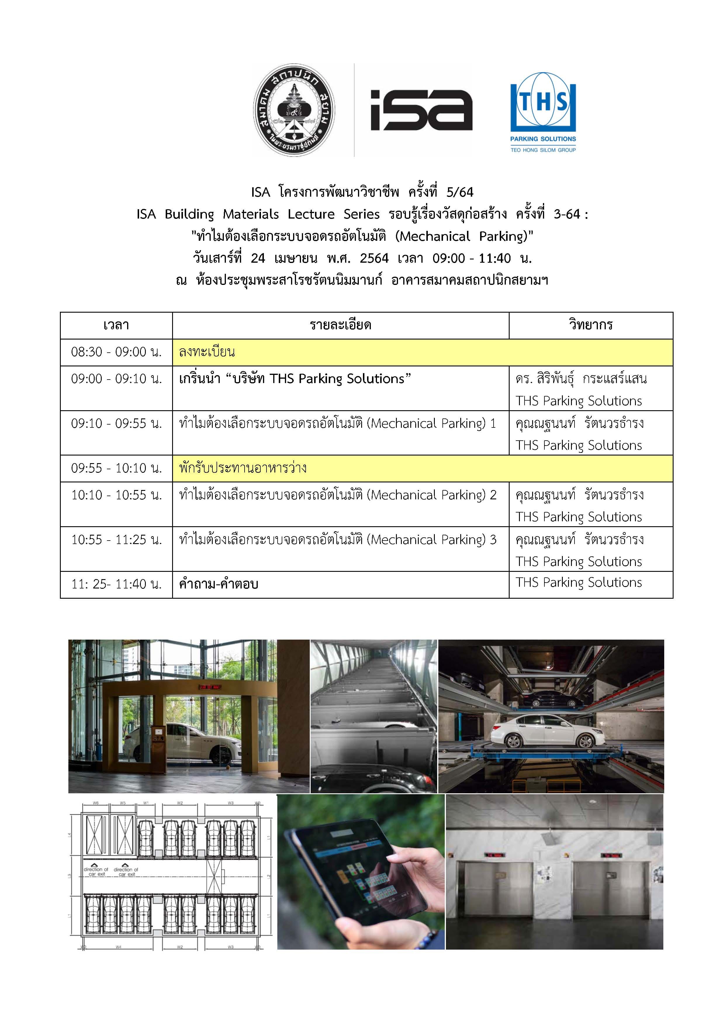 24 เม.ย. 64 | ISA โครงการพัฒนาวิชาชีพ ครั้งที่ 5/64 “ทำไมต้องเลือกระบบจอดรถอัตโนมัติ (Mechanical Parking)”