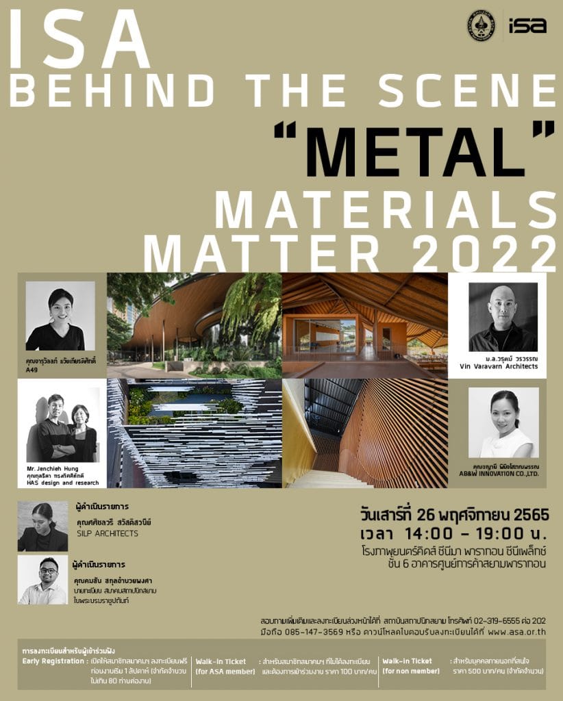 การใช้วัสดุโลหะในปัจจุบันมีความแพร่หลายมากขึ้น สร้างความหลากหลายในการเลือกใช้ และการนำไปใช้ที่แตกต่างไปจากที่เคยเป็น จารุวัลลภ์ ธวัชเกียรติศักดิ์, ม.ล.วรุตม์ วรวรรณ, เจอร์รี่ หง (Jenchieh Hung) และ กุลธิดา ทรงกิตติภักดี รวมตัวกันมาเล่าความเป็นไปได้ใหม่และการฉีกข้อจำกัดเดิมๆ ของการใช้วัสดุโลหะที่สร้างพัฒนาการและก่อให้เกิดนวัตกรรมใหม่ในวงการสถาปัตยกรรม ร่วมกับผู้เชี่ยวชาญด้านวัสดุโลหะโดยเฉพาะอะลูมิเนียม คุณชญานี พินิจโสภณพรรณ รองกรรมการผู้จัดการ AB&W INNOVATION CO.,LTD.