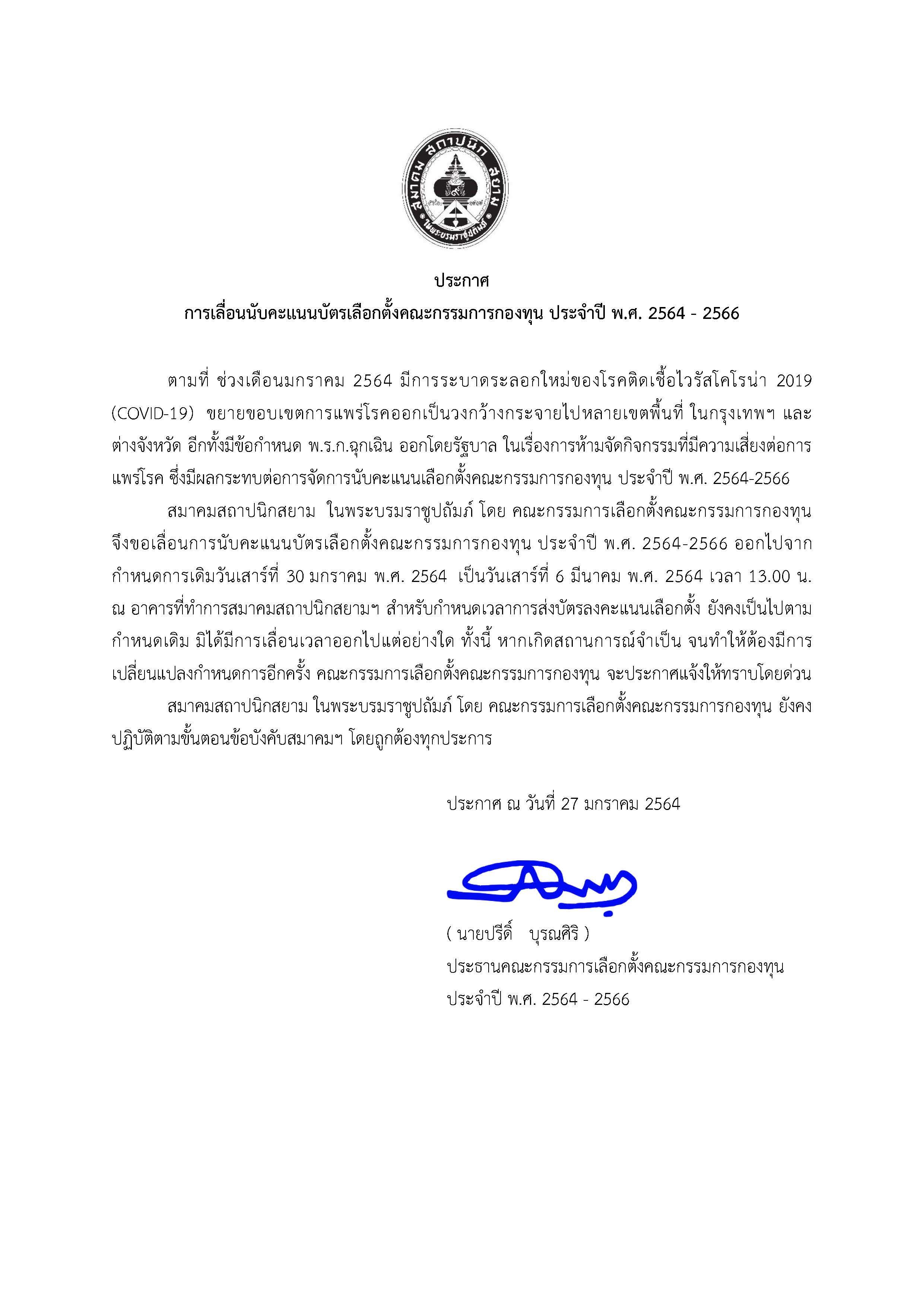 ประกาศ เลื่อนกำหนดการนับคะแนนเลือกตั้งคณะกรรมการกองทุน ประจำปี พ.ศ. 2564-2566