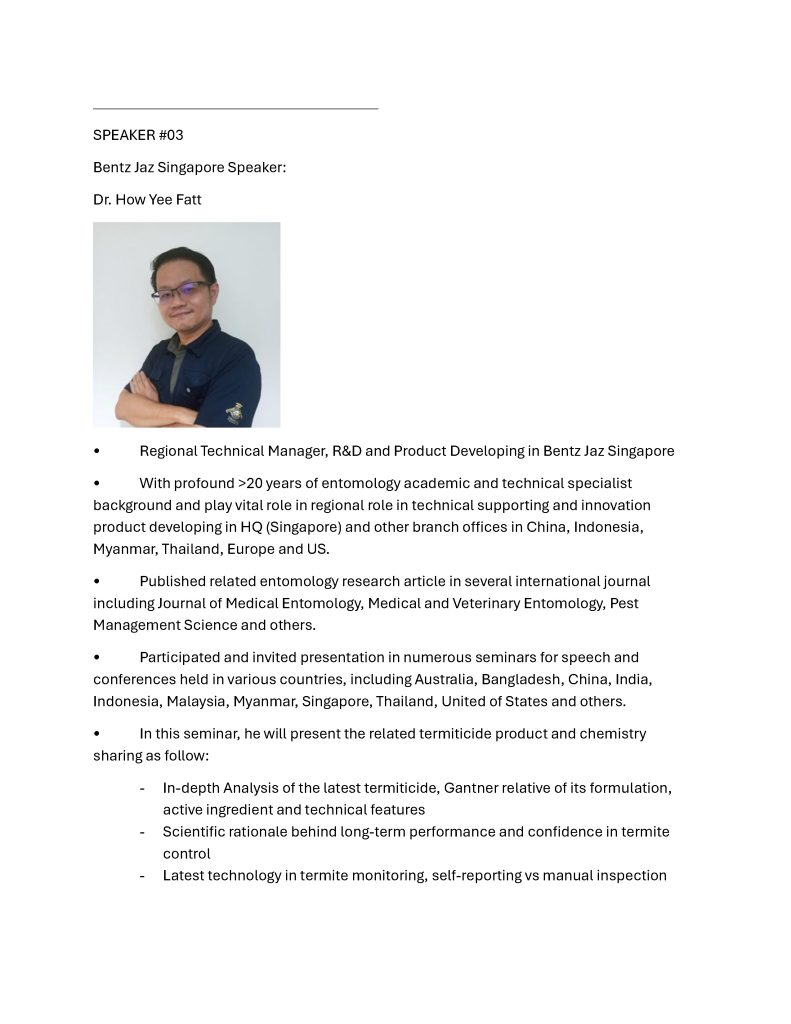 บริษัท เบนซ์แจซ ประเทศไทย จะจัดงานอบรมสัมนาเรื่ องการป้องกันปั ญหาปลวกตามมาตรฐานสากล ตั้งแต่ ฐานราก ระยะกำลังก่อสร้าง มาจนถึงการป้องกัน เฝ้าระวังอาคาร/สถานที่ที่สร้ างเสร็จ เข้าใช้ประโยชน์แล้ว จึ งขอความอนุเคราะห์สมาคมฯ ดังนี้