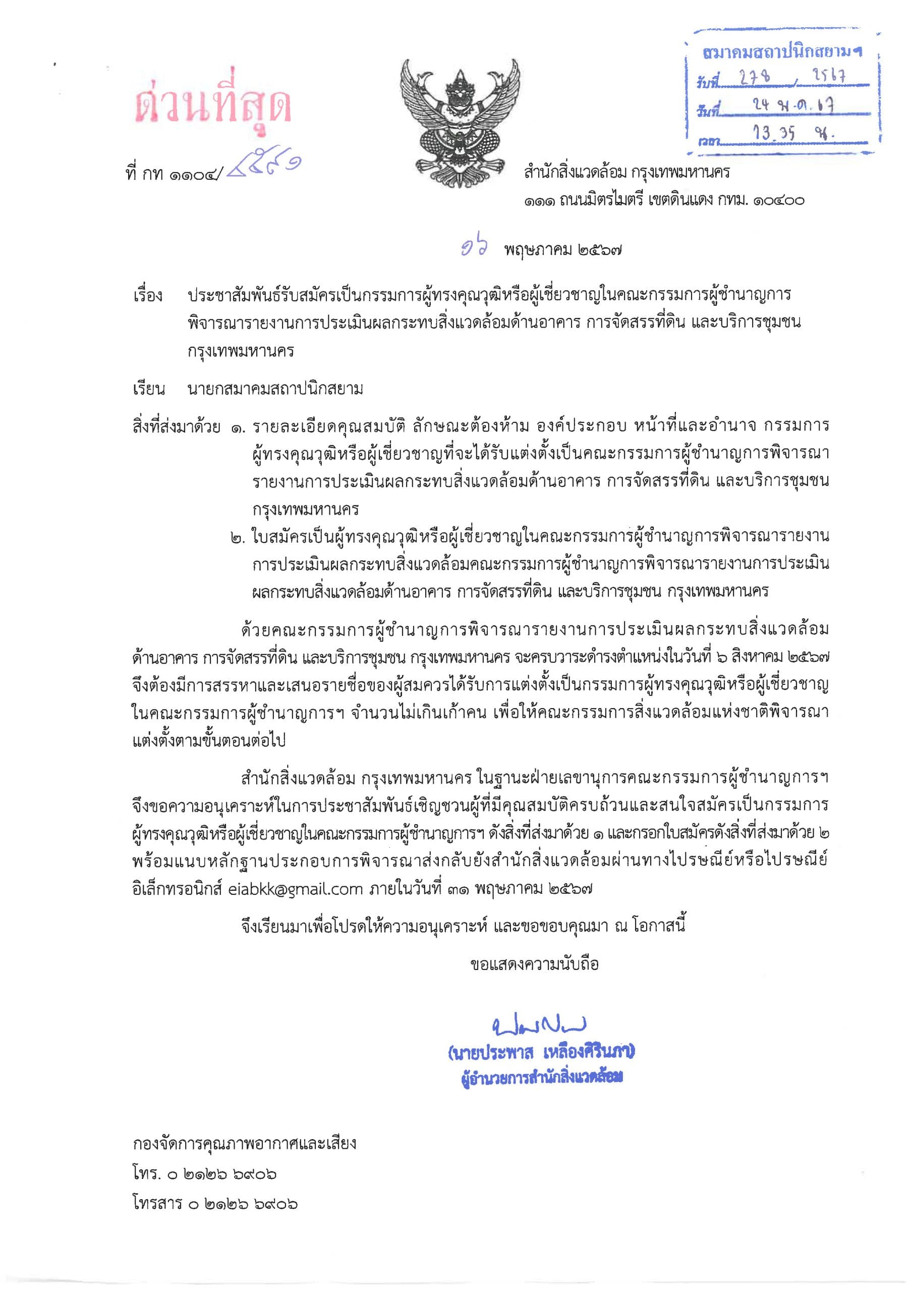 ประชาสัมพันธ์รับสมัครเป็นกรรมการผู้ทรงคุณวุฒิหรือผู้เชี่ยวชาญในคณะกรรมการผู้ชำนาญการ พิจารณารายงานการประเมินผลกระทบสิ่งแวดล้อมด้านอาคาร