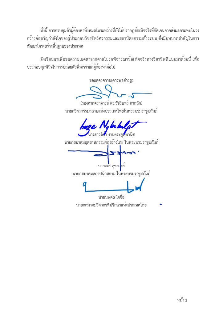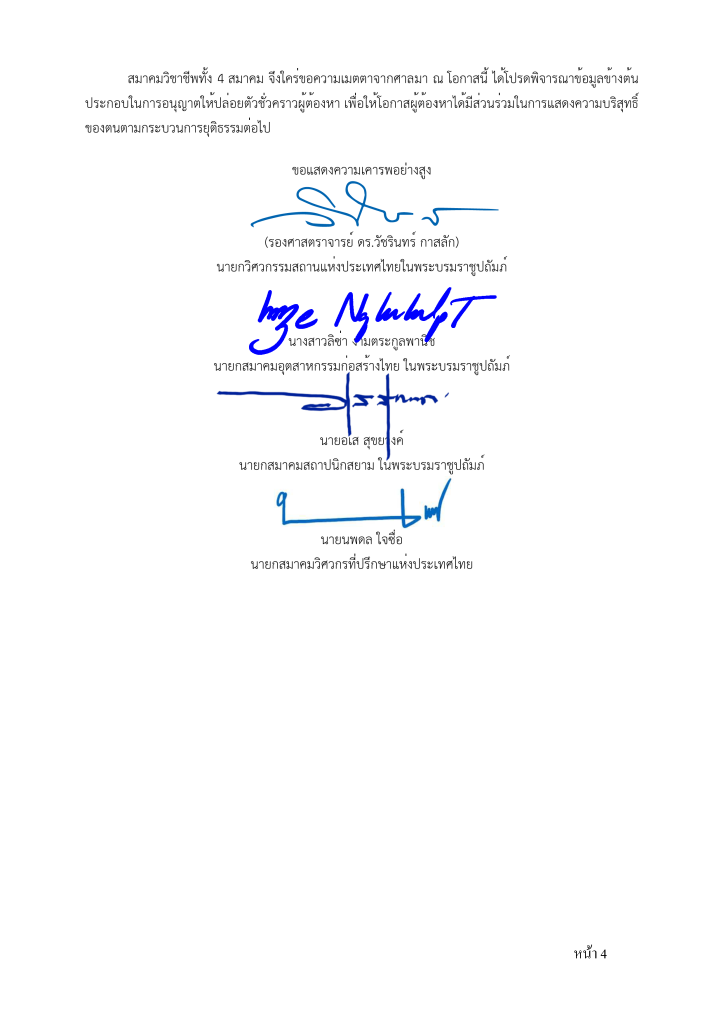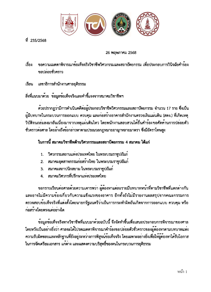 ทั้ง 4 สมาคมฯ ได้มีมติเห็นพ้อง ที่จะต้องส่งข้อมูลที่สำคัญเพื่อควาเข้าใจทีถูกต้องต่อมาตรฐาน บทบาทและหน้าที่ กลุ่มผู้ออกแบบ จึงได้มีการร่างหนังสือร่วมกัน โดย นายกสมาคมทั้ง 4 สมาคม เพื่อนำเสนอข้อมูลและข้อเท็จจริง ในการออกแบบอาคารต่อสำนักงานศาลยุติธรรม และเผยแพร่สู่สาธารณะ และเพื่อขอความเมตตาศาลยุติธรรม พิจารณาการประกันตัว 17 ผู้ออกแบบอีกครั้ง โดยทางวิศวกรรมสถานแห่งประเทศไทยในพระบรมราชูปถัมภ์ ออกรับหน้าที่เป็นเจ้าภาพผู้ออกหนังสือและนำส่งสำนักงานศาลยุติธรรม เมื่อเช้าวันจันทร์ ที 26 พฤษภาคม 2568 เวลา 9:00 น.