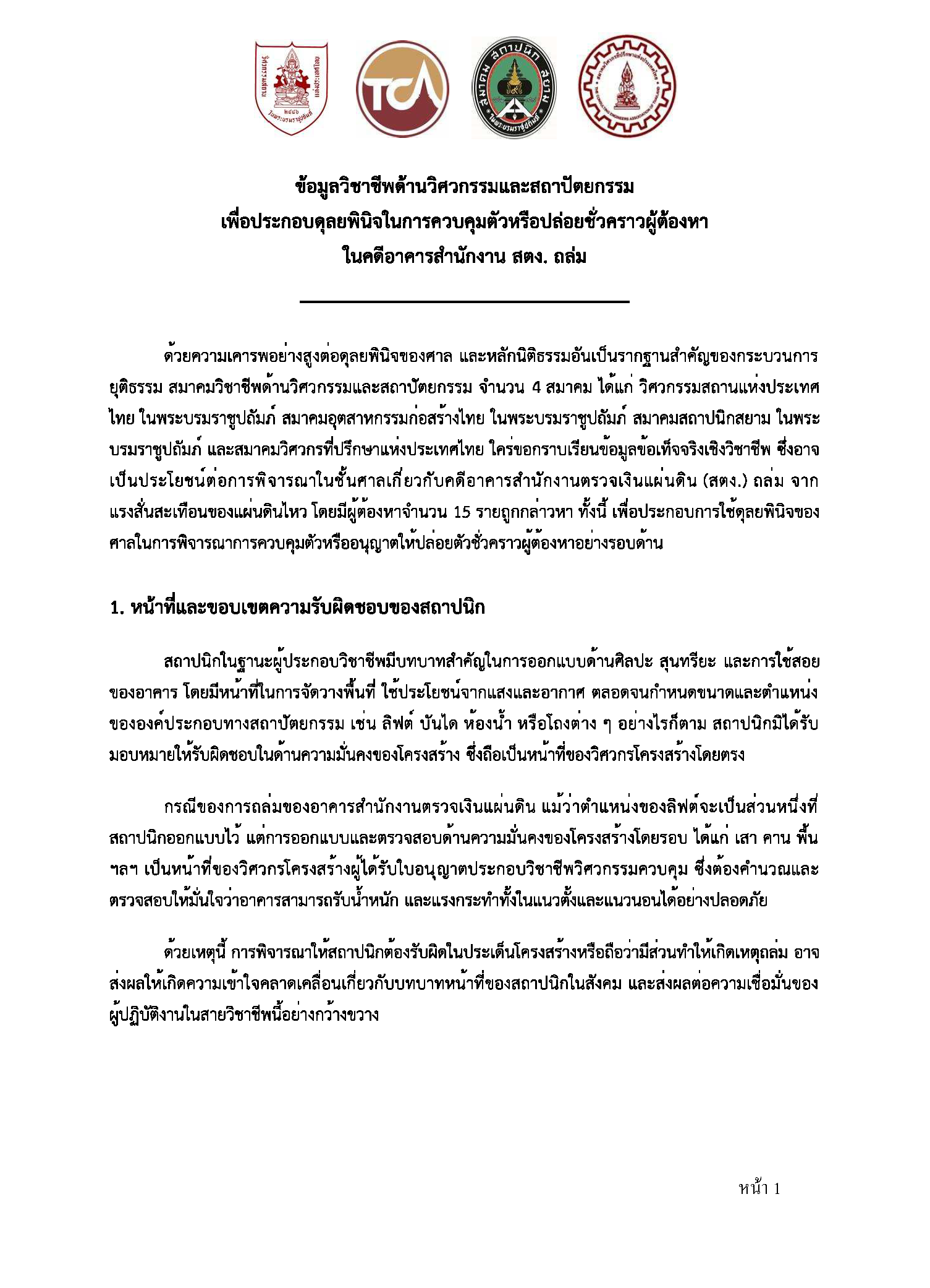 4 สมาคมวิชาชีพยื่นหนังสือต่อศาลเพื่อขอปล่อยตัวชั่วคราว กรณีตึก สตง.ถล่ม
