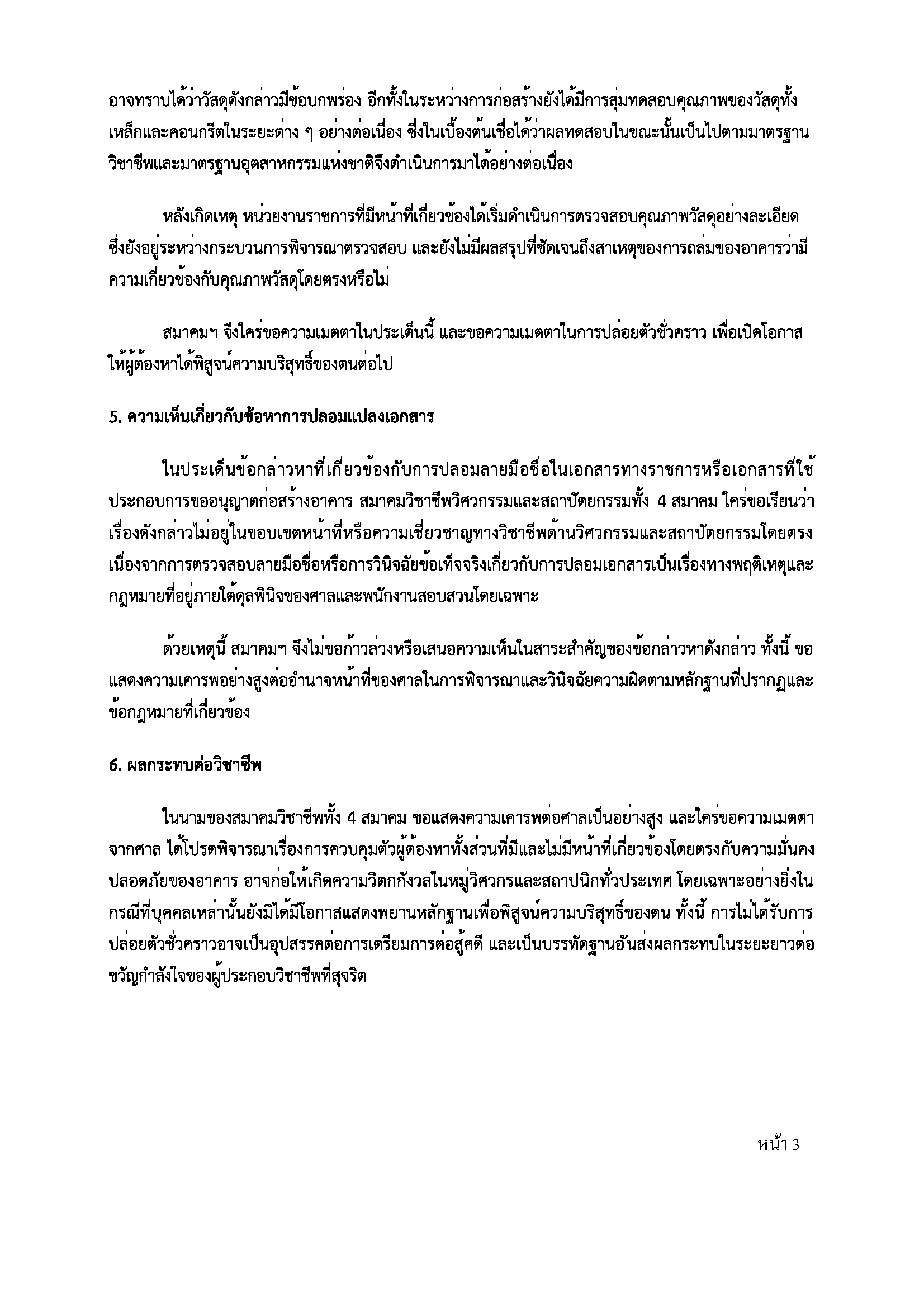4 สมาคมวิชาชีพยื่นหนังสือต่อศาลเพื่อขอปล่อยตัวชั่วคราว กรณีตึก สตง.ถล่ม