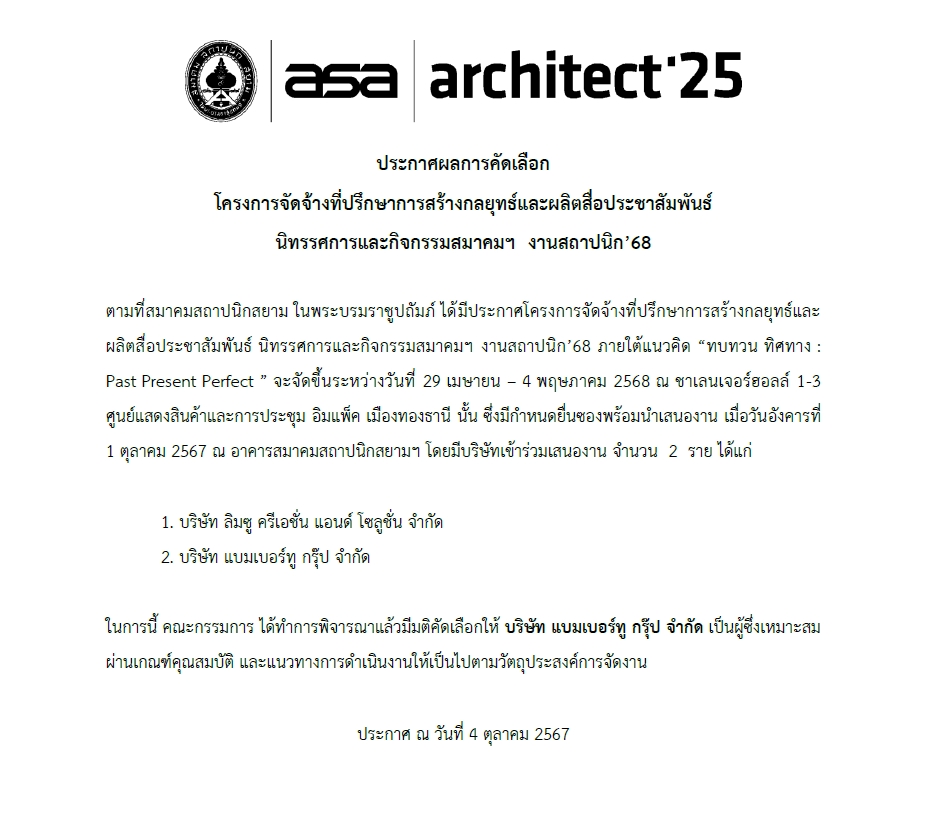 Home » News » ประกาศผลการคัดเลือก โครงการจัดจ้างที่ปรึกษาการสร้างกลยุทธ์และผลิตสื่อประชาสัมพันธ์ นิทรรศการและกิจกรรมสมาคมฯ งานสถาปนิก’68