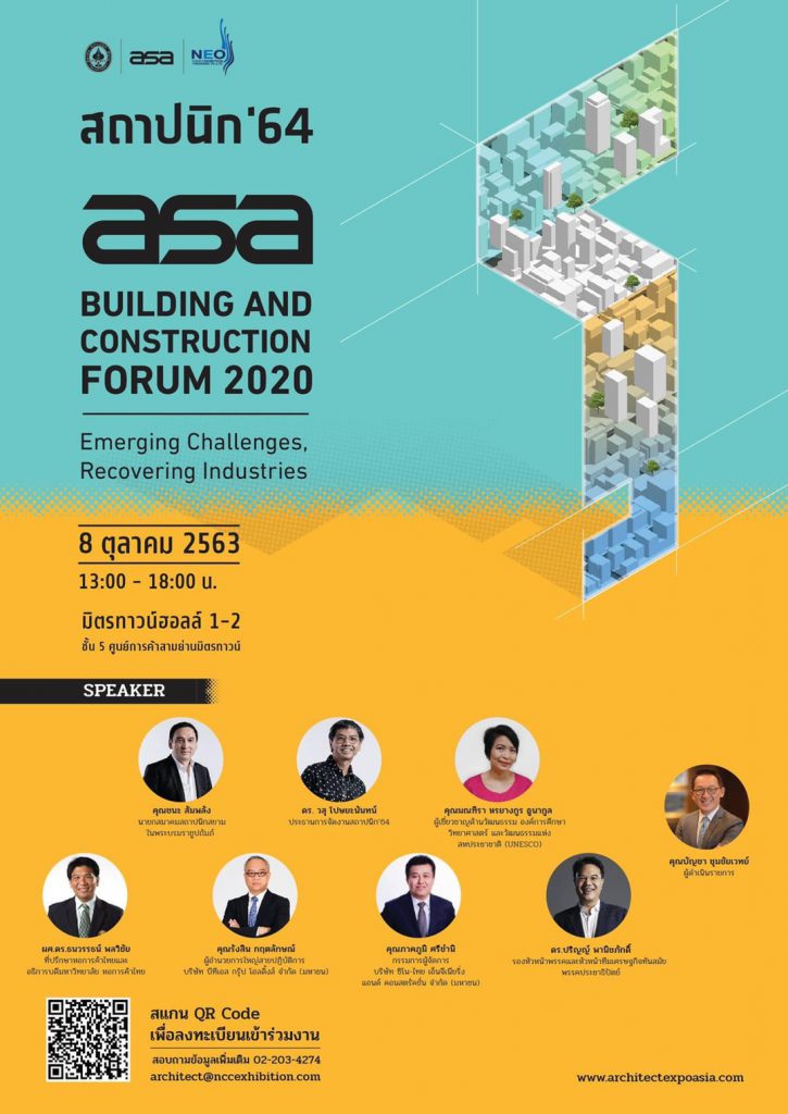 สมาคมสถาปนิกสยาม ในพระบรมราชูปถัมภ์ ร่วมกับ บริษัท เอ็น.ซี.ซี. เอ็กซิบิชั่น ออกาไนเซอร์ จำกัด (นีโอ) จัดสัมมนาชี้โอกาสทางธุรกิจเเละทิศทางฟื้นตัวของวงการสถาปัตยกรรมเเละการก่อสร้าง ภายใต้ชื่องาน ASA Building and Construction Forum