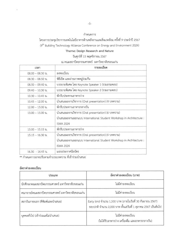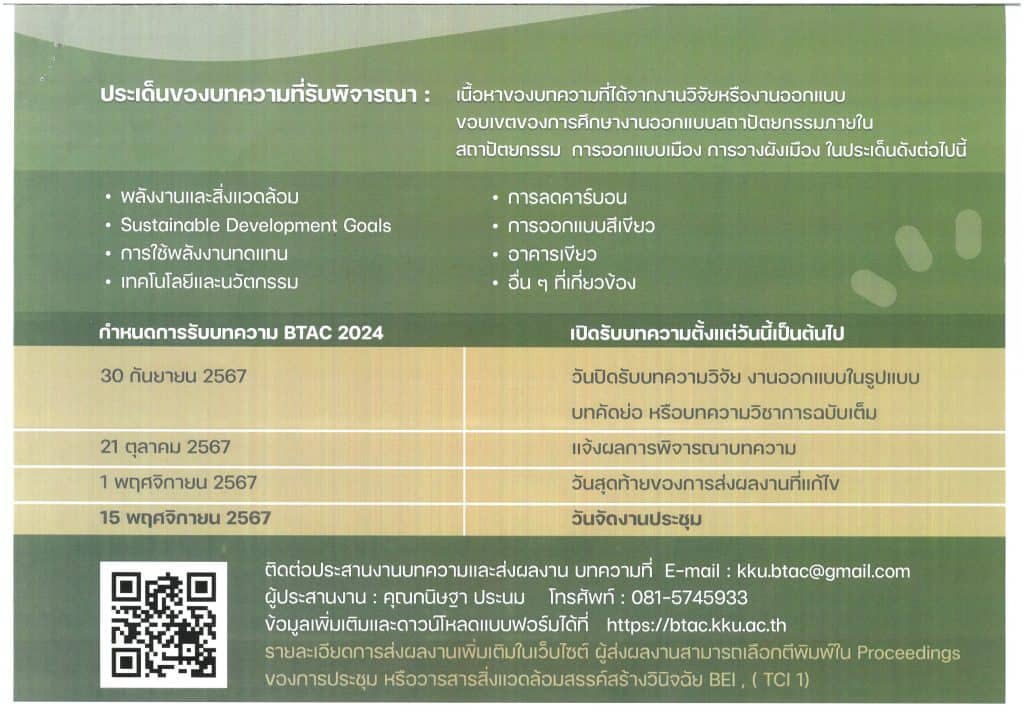 ด้วย คณะสถาปัตยกรรมศาสตร์ มหาวิทยาลัยขอนแก่น จัดโครงการประชุมวิ ชาการเทคโนโลยีอาคารด้านพลั งงานและสิ่งแวดล้อม ครั้งที่ 9 ประจำปี 2567 (9th Building Technology Alliance Conference on Energy and Environment 2024) ในวันที่ 15 พ.ย. 2567 ณ ม.ขอนแก่น จ.ขอนแก่น ภายใต้เนื้อหา “Design Research and Nature” เพื่อเป็นเวทีนำเสนอผลงานทางวิชาการ จึงขอความอนุเคราะห์ประชาสัมพั นธ์การเปิดรับพิจารณาบทความด้ านสถาปัตยกรรม เทคโนโลยีอาคารพลังงานและสิ่งแวดล้อมที่เกี่ ยวข้องกับอาคาร