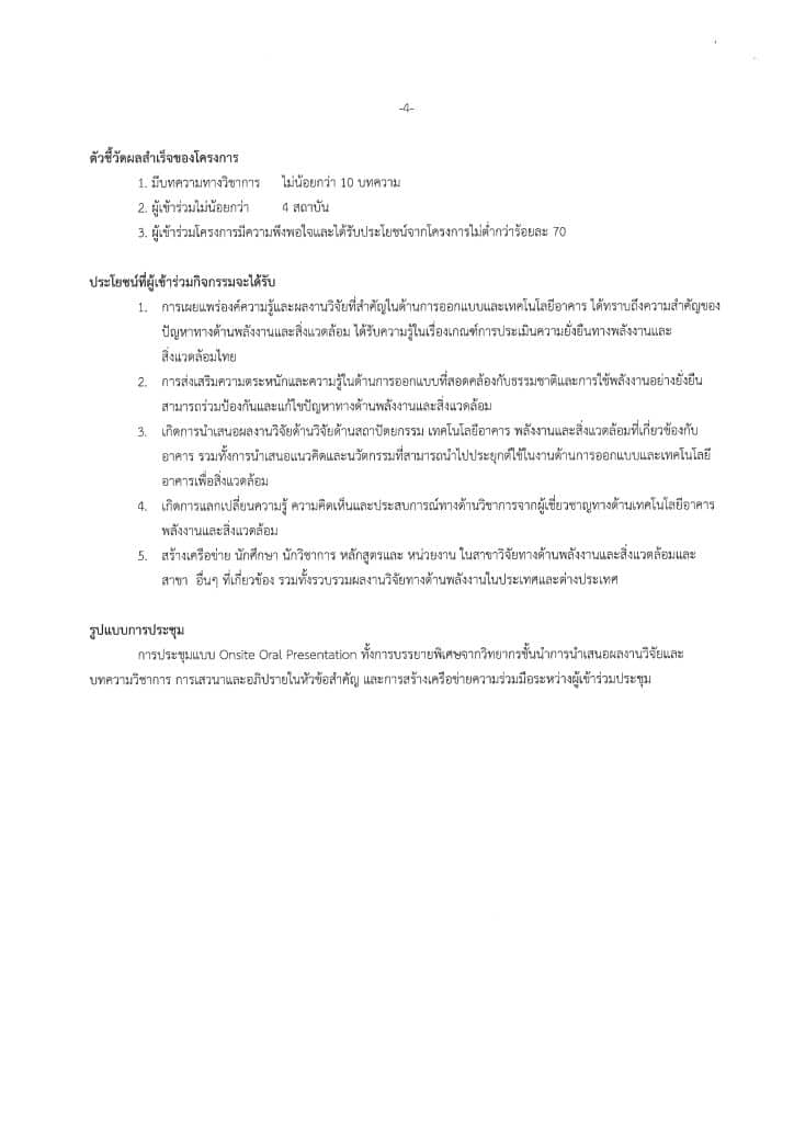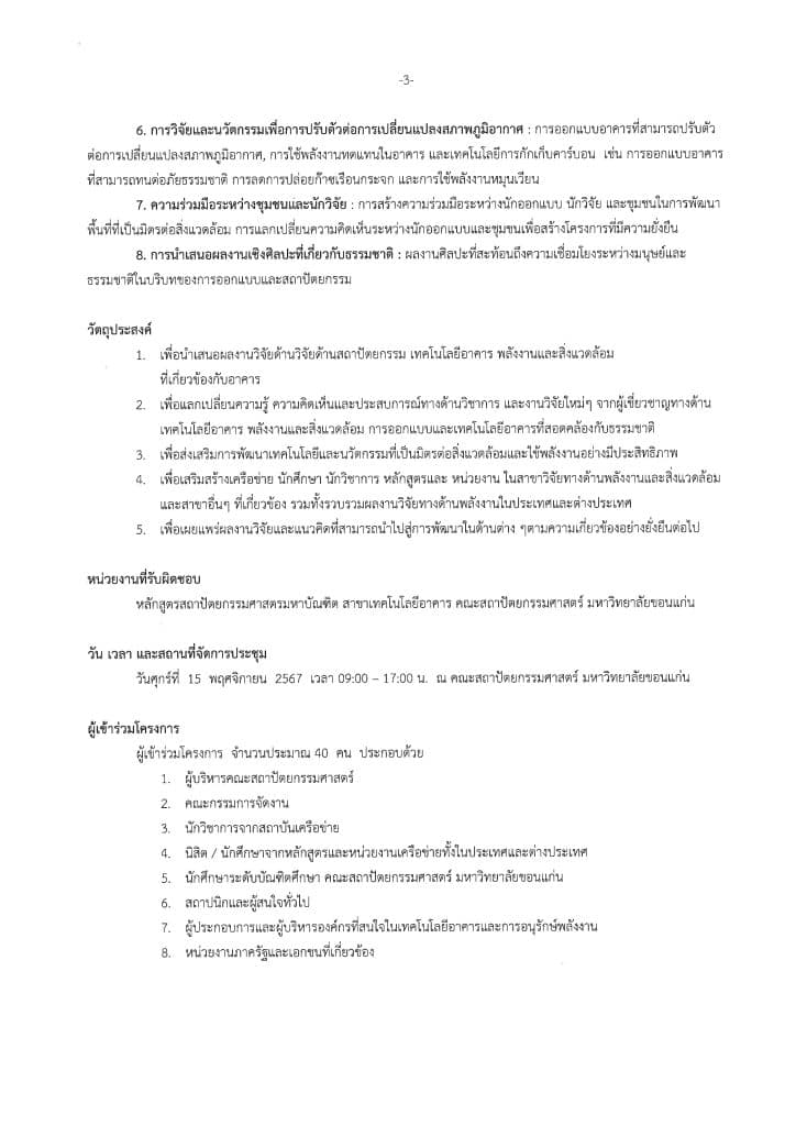 ด้วย คณะสถาปัตยกรรมศาสตร์ มหาวิทยาลัยขอนแก่น จัดโครงการประชุมวิ ชาการเทคโนโลยีอาคารด้านพลั งงานและสิ่งแวดล้อม ครั้งที่ 9 ประจำปี 2567 (9th Building Technology Alliance Conference on Energy and Environment 2024) ในวันที่ 15 พ.ย. 2567 ณ ม.ขอนแก่น จ.ขอนแก่น ภายใต้เนื้อหา “Design Research and Nature” เพื่อเป็นเวทีนำเสนอผลงานทางวิชาการ จึงขอความอนุเคราะห์ประชาสัมพั นธ์การเปิดรับพิจารณาบทความด้ านสถาปัตยกรรม เทคโนโลยีอาคารพลังงานและสิ่งแวดล้อมที่เกี่ ยวข้องกับอาคาร