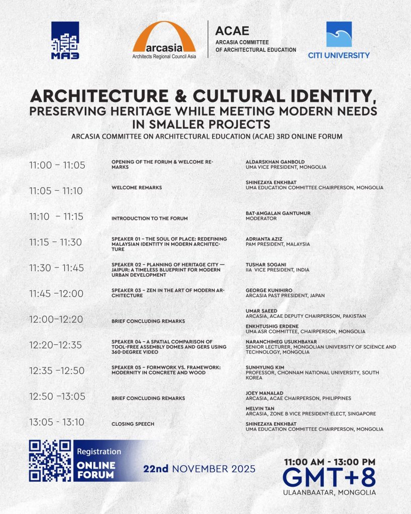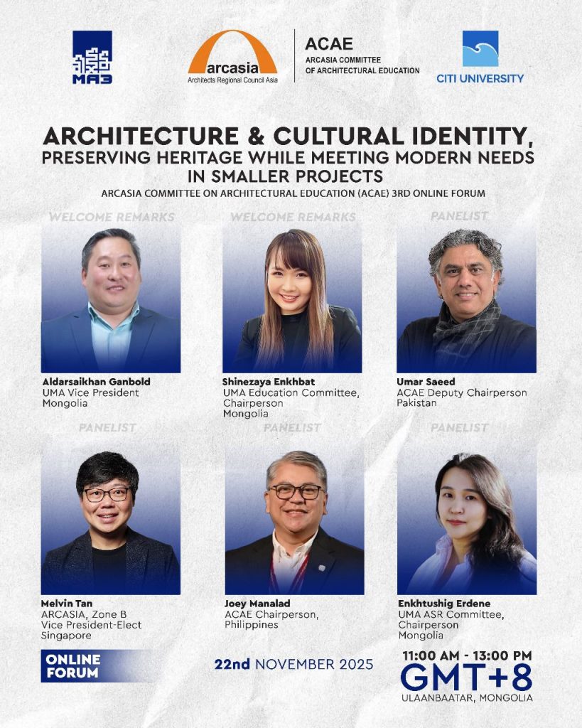 #ACAE #ARCASIA #UMA #CITIUniversity #ArchitectureEducation #CulturalIdentity #HeritageAndModernity #OnlineForum