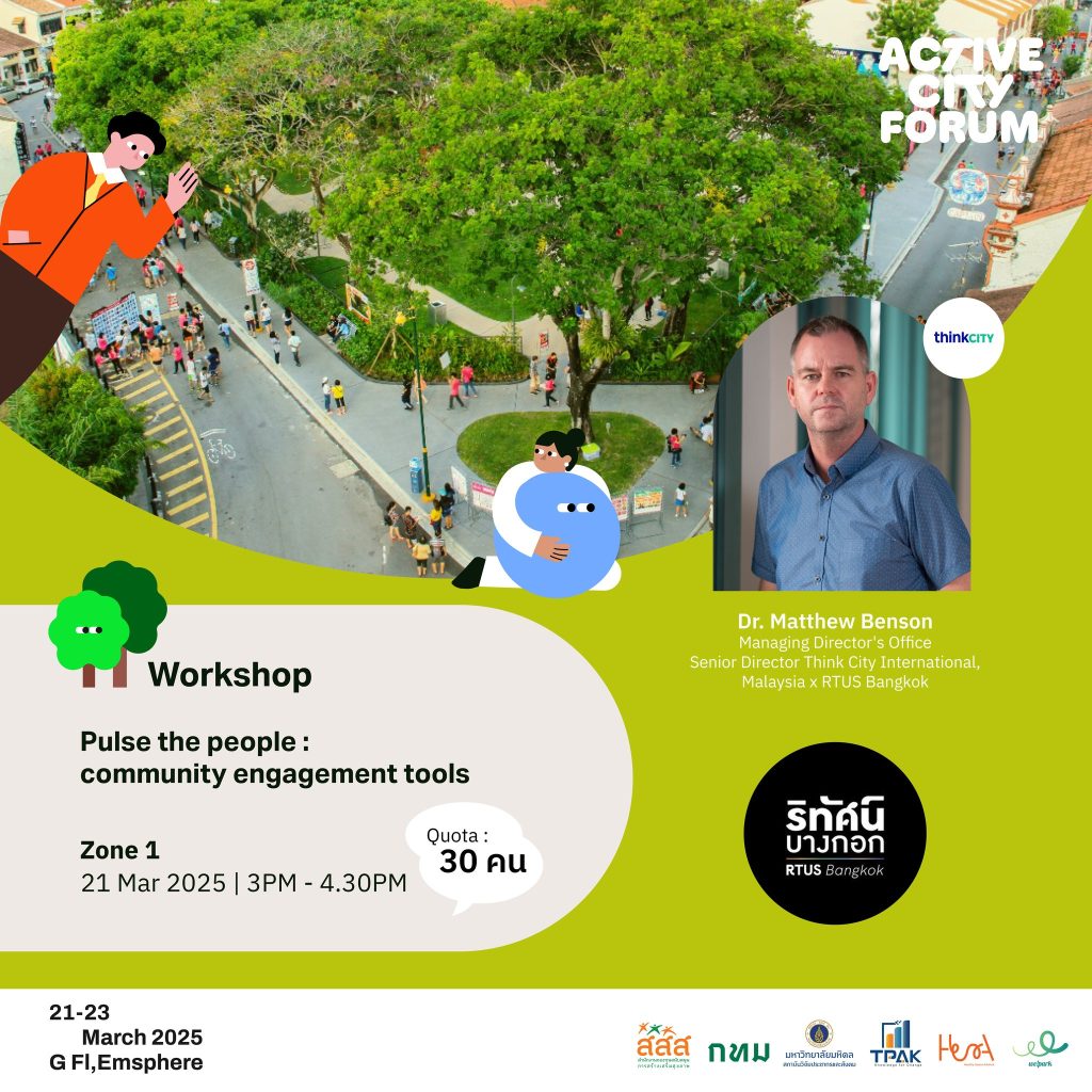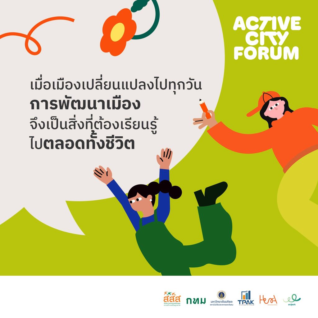 ไม่ว่าคุณจะเป็นคนทำงานเมือง อาจารย์ นักเรียนนักศึกษา หรือคนเมืองเดินดินธรรมดาๆ ที่มีใจรักในการเปลี่ยนแปลงชุมชนรอบตัวให้ดีขึ้น Active City Forum อยากชวนทุกคนมาอัพเดทองค์ความรู้ เติมประสบการณ์ และเก็บเกี่ยวเครื่องมือใหม่ๆ กลับบ้านไปทำงานต่อ