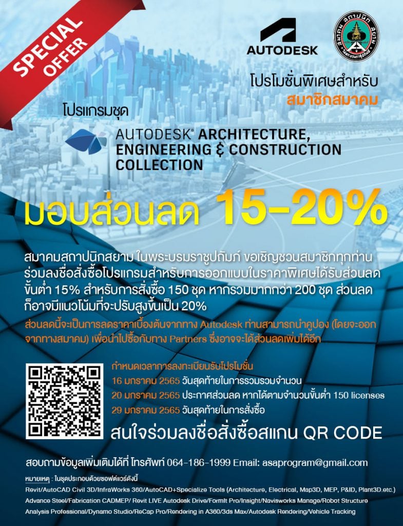 สมาคมสถาปนิกสยามได้มีความร่วมมือกับบริษัท Autodesk เพื่อหาแนวทางให้กับสมาชิกได้ซื้อ Software ที่ใช้ประกอบวิชาชีพในราคาที่ถูกลง. ทั้งนี้ทาง Autodesk จึงได้จัดโปรโมชั่นพิเศษให้กับทางสมาคมสำหรับ ชุด AEC Collection