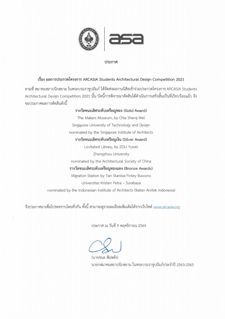 ผลการประกวดโครงการ ARCASIA Students Architectural Design Competition 2022