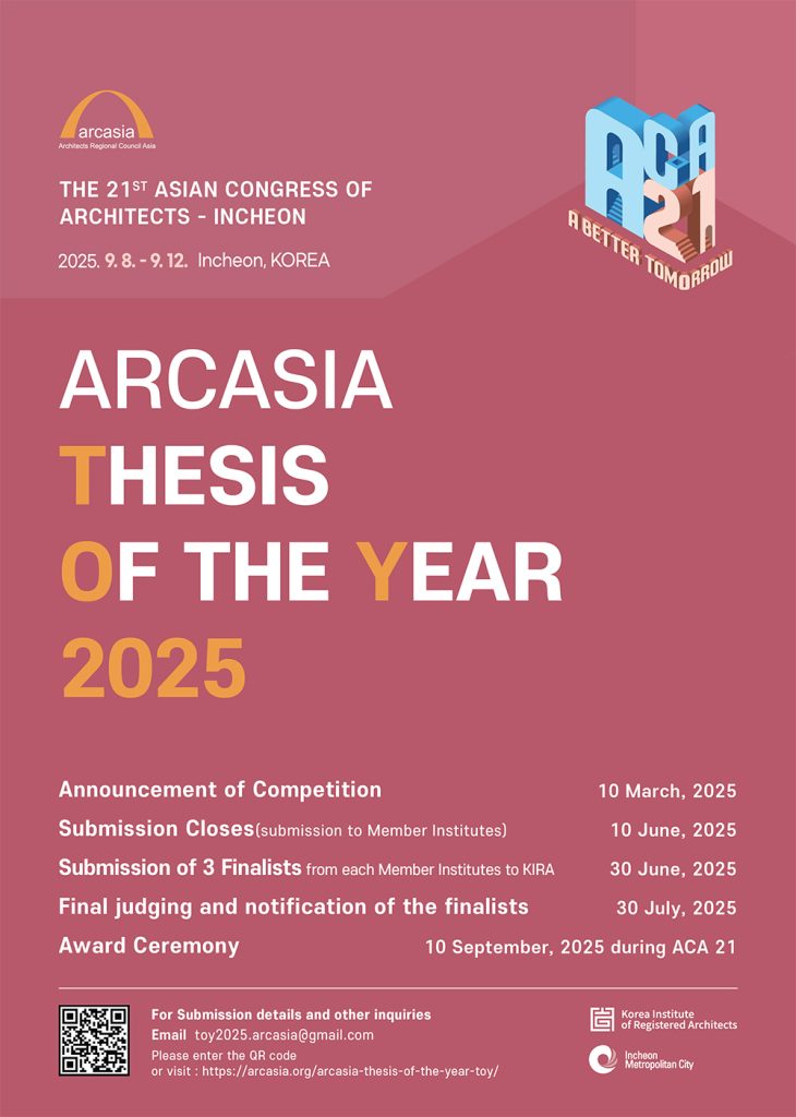 สมาคมสถาปนิกสยาม ในพระบรมราชูปถัมภ์ ขอแสดงความยินดีกับ คุณคนึง ผารินทร์ นักศึกษาระดับปริญญาตรี ชั้นปีที่ 4 คณะสถาปัตยกรรมศาสตร์ มหาวิทยาลัยเชียงใหม่ ที่ได้รับการเสนอชื่อเป็น Finalist ในโครงการ ARCASIA THESIS OF THE YEAR 2025 ผลงานที่ได้รับคัดเลือก คือ “สถาปัตยกรรมแห่งแสงเพื่อคนตาบอด (Architecture of Light for the Blind)” ซึ่งผลงานได้นำไปจัดแสดงภายในงาน The 21st Asian Congress of Architects (ACA-21) ระหว่างวันที่ 8–12 กันยายน 2568 ณ เมืองอินชอน สาธารณรัฐเกาหลี