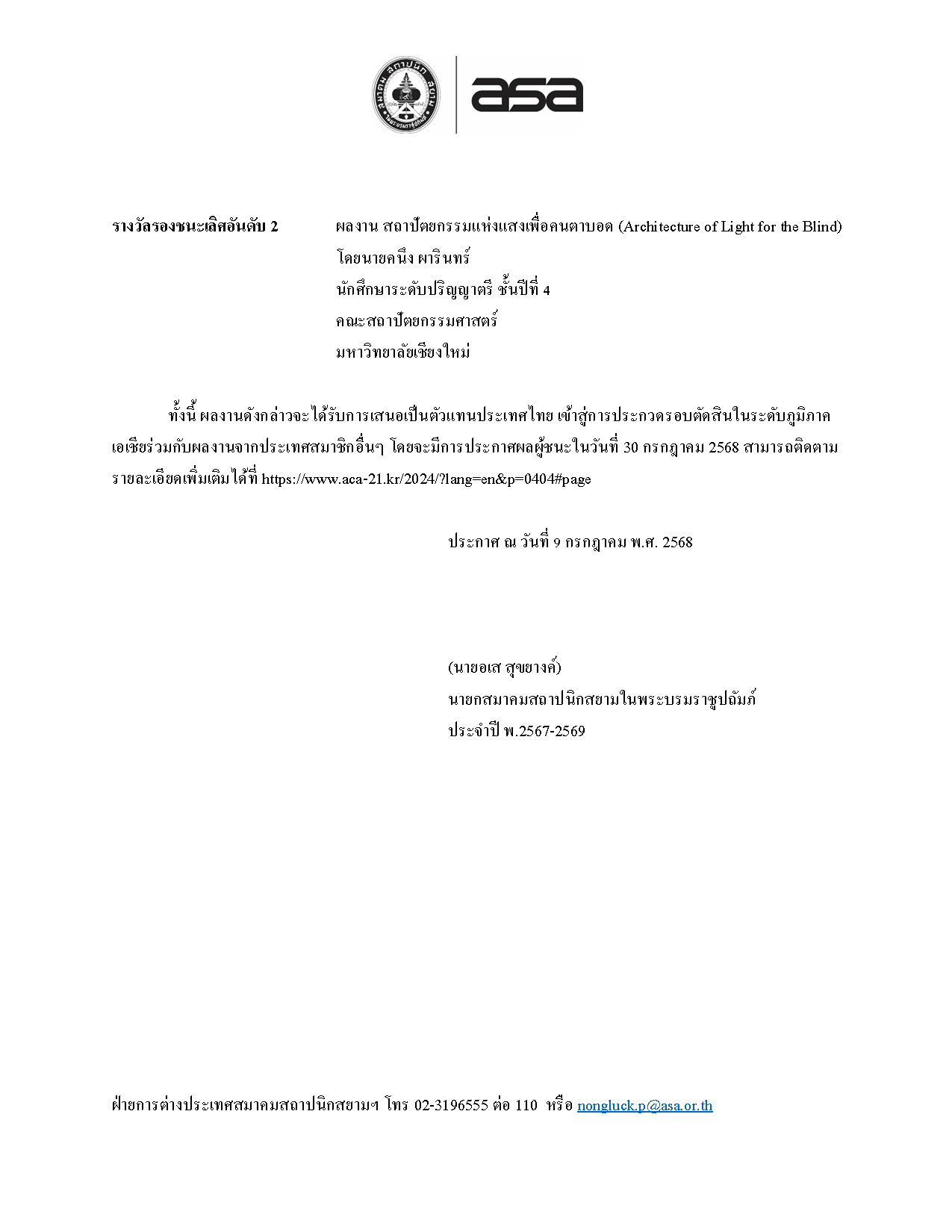 ประกาศ ผลการคัดเลือกผลงานนิสิตนักศึกษาเข้าร่วมโครงการ ARCASIA Thesis of The Year 2025