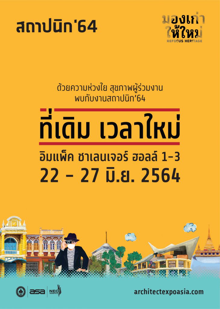 Since our first priority is the safety of the fair goers, the Association of Siamese Architects under Royal Patronage, along with N.C.C. Exhibition Organizer Co., Ltd. (NEO), decided to postpone the Architect’21 “Refocus Heritage” to 22 – 27 Jun 2021, at Challenger Hall 1-3, IMPACT Exhibition Center, Bangkok, Thailand.