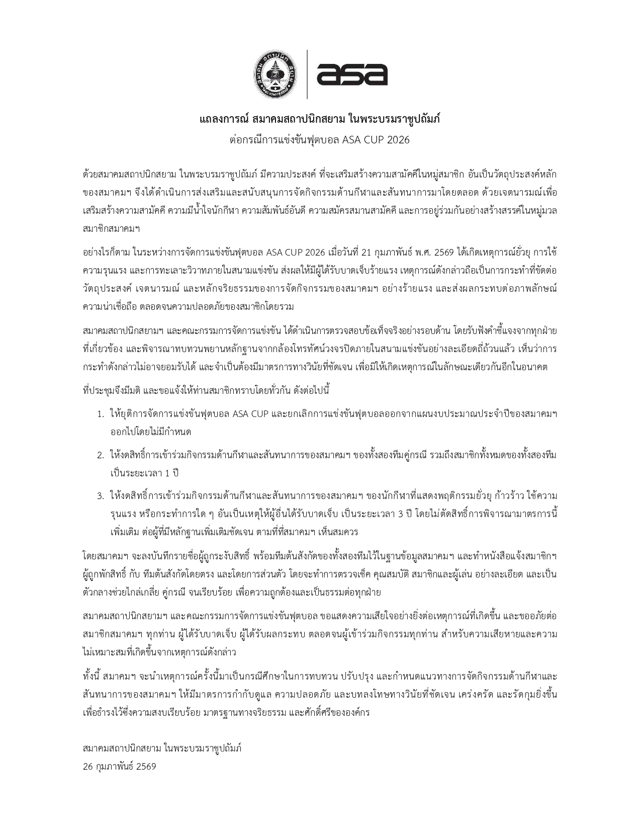 แถลงการณ์ ต่อกรณีการแข่งขันฟุตบอล ASA CUP 2026 (final)