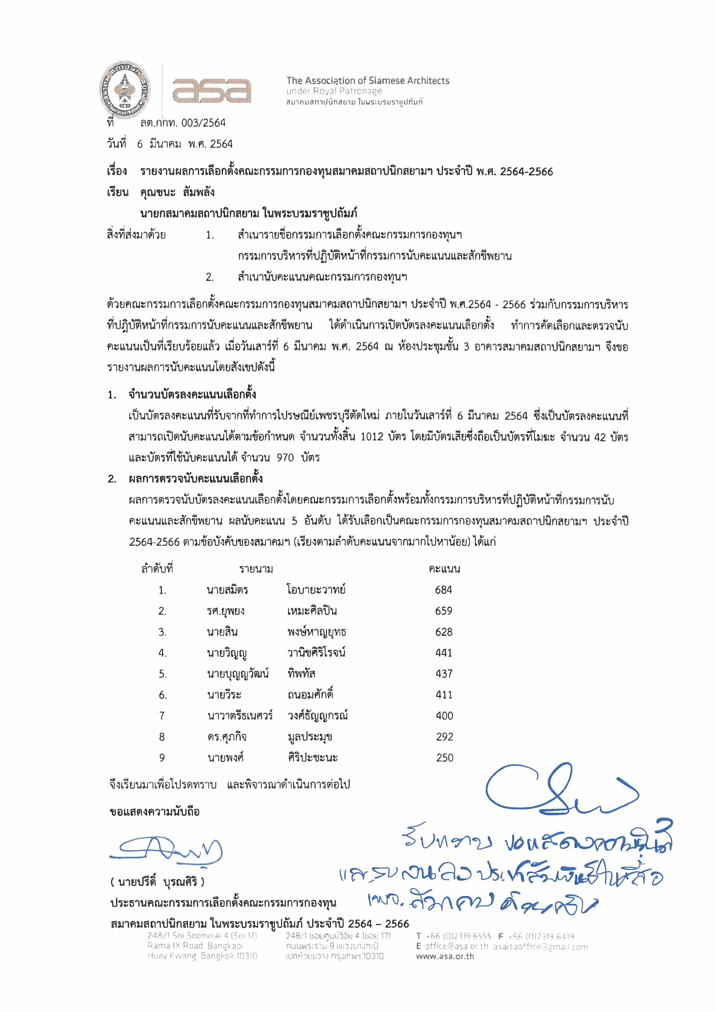 ประกาศผลการเลือกตั้งกรรมการกองทุน สมาคมสถาปนิกสยาม ในพระบรมราชูปถัมภ์ ประจำปี พ.ศ. 2564-2566