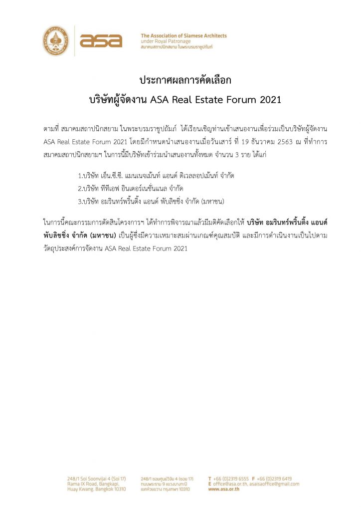ประกาศผลการคัดเลือก บริษัทผู้จัดงาน ASA Real Estate Forum 2021