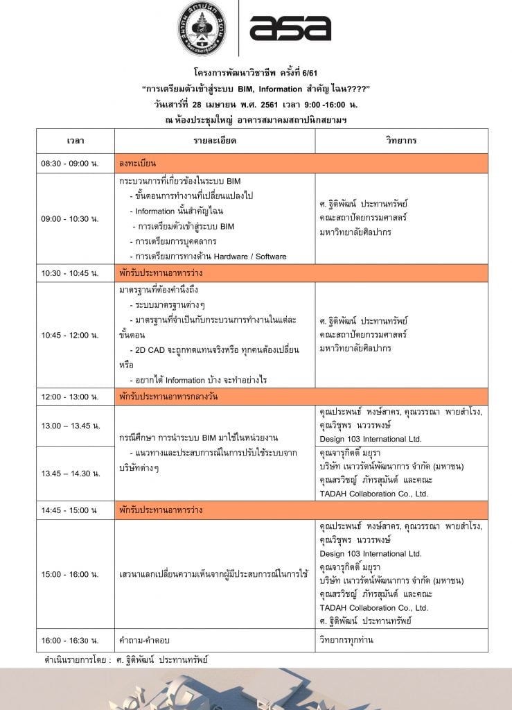 Home » News » 28 เม.ย. 61 | โครงการพัฒนาวิชาชีพ ครั้งที่ 6/61 “การเตรียมตัวเข้าสู่ระบบ BIM, Information สำคัญไฉน????”