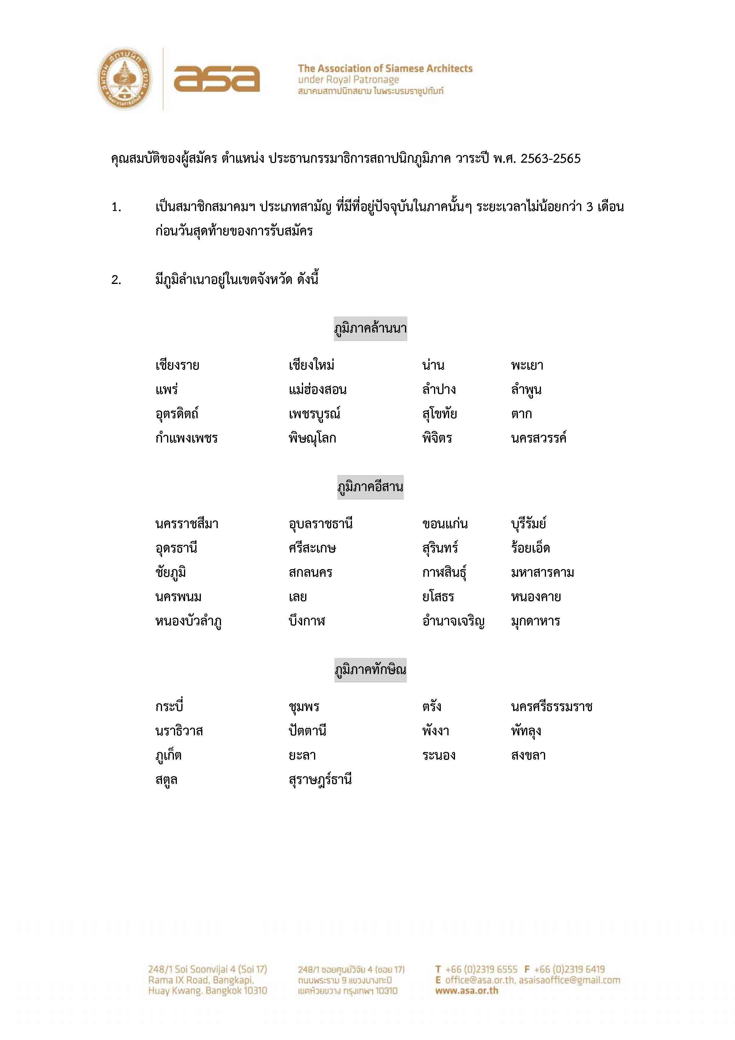 ขอเรียนเชิญสมัครรับเลือกตั้งเป็นประธานกรรมาธิการสถาปนิก 3 ภูมิภาค สมาคมสถาปนิกสยาม ในพระบรมราชูปถัมภ์ วาระปี พ.ศ. 2563-2565