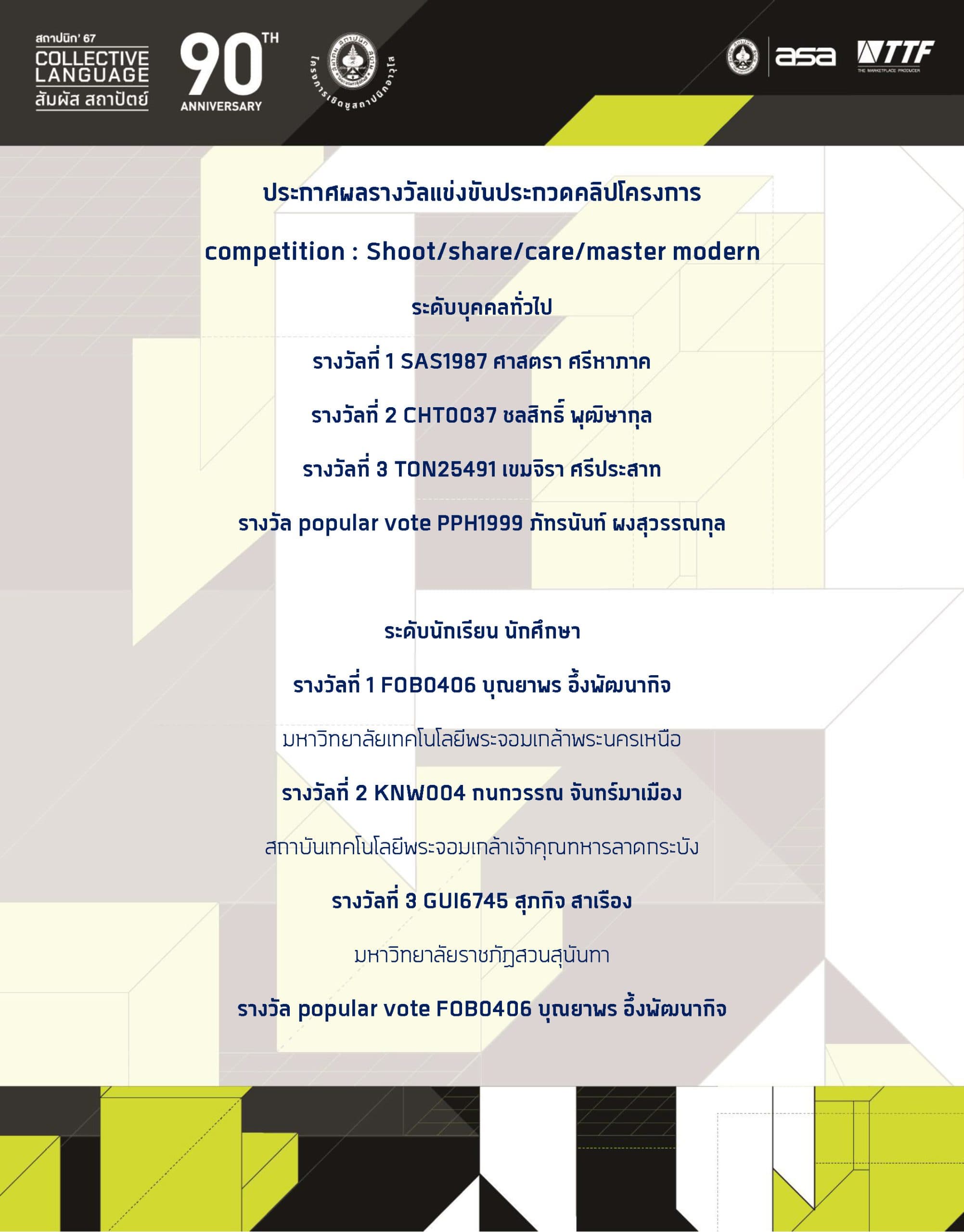 ประกาศผลรางวัลแข่งขันประกวดคลิปโครงการ competition : Shoot/share/care/master modern