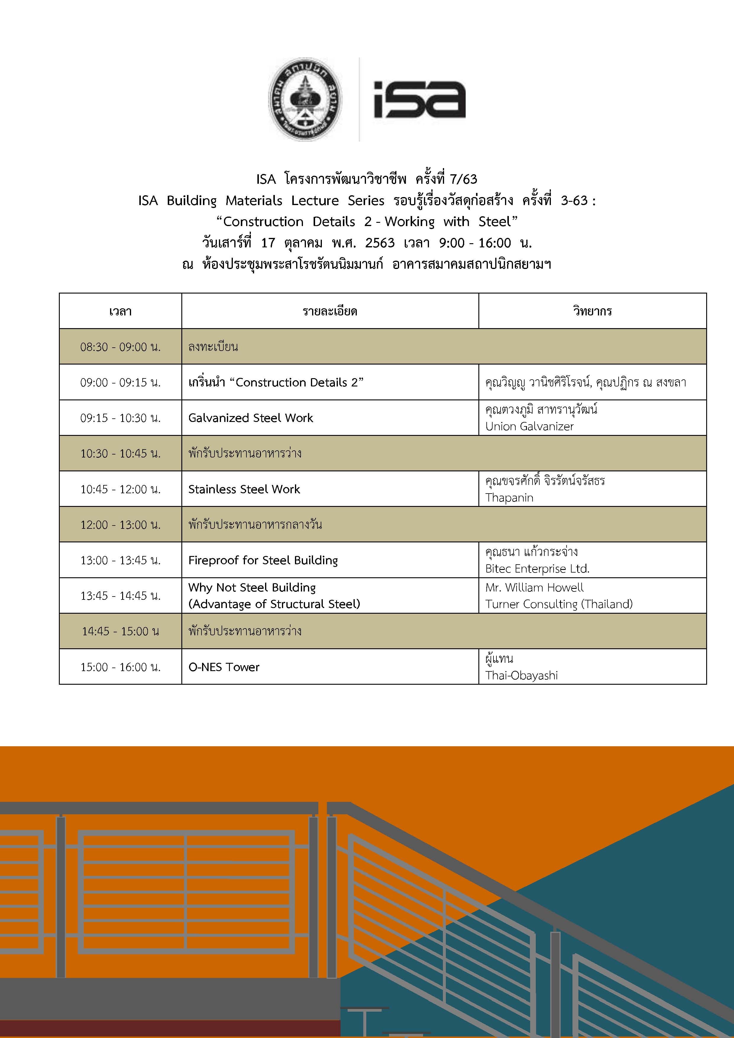 17 ต.ค. 63 | ISA โครงการพัฒนาวิชาชีพ ครั้งที่ 7/63 “Construction Details 2 – Working with Steel”