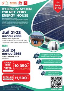 เชิญเข้าร่วมฝึกอบรมเชิงปฏิบัติการ เรื่อง “ระบบผลิตไฟฟ้าแบบผสมผสานเพื่อบ้านที่อยู่อาศัยพลังงานสุทธิเป็นศูนย์ (Hybrid PV System for Net Zero Energy House)”